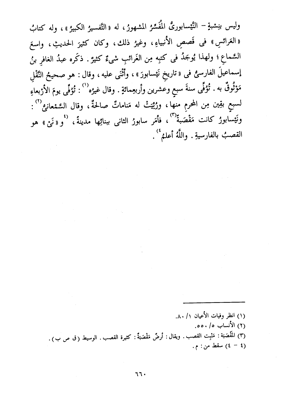 أَيْضًا وَلَيْسَ بِنِسْبَةٍ - النَّيْسَابُورِيُّ الْمُفَسِّرُ الْمَشْهُورُ، لَهُ " التَّفْسِيرُ الْكَبِيرُ "، وَلَهُ كِتَابُ " الْعَرَائِسِ " فِي قَصَصِ الْأَنْبِيَاءِ، وَغَيْرُ ذَلِكَ، وَكَانَ كَثِيرَ الْحَدِيثِ، وَاسِعَ السَّمَاعِ ; وَلِهَذَا يُوجَدُ فِي كُتُبِهِ مِنَ الْغَرَائِبِ شَيْءٌ كَثِيرٌ. ذَكَرَهُ عَبْدُ الْغَافِرِ بْنُ إِسْمَاعِيلَ الْفَارِسِيُّ فِي " تَارِيخِ نَيْسَابُورَ " وَأَثْنَى عَلَيْهِ، وَقَالَ: هُوَ صَحِيحُ النَّقْلِ مَوْثُوقٌ بِهِ. تُوُفِّيَ سَنَةَ سَبْعٍ وَعِشْرِينَ وَأَرْبَعِمِائَةٍ. وَقَالَ غَيْرُهُ: تُوُفِّيَ يَوْمَ الْأَرْبِعَاءِ لِسَبْعٍ بَقِينَ مِنَ الْمُحَرَّمِ مِنْهَا، وَرُئِيَتْ لَهُ مَنَامَاتٌ صَالِحَةٌ، وَقَالَ السَّمْعَانِيُّ: وَنَيْسَابُورُ كَانَتْ مَقْصَبَةً، فَأَمَرَ سَابُورُ الثَّانِي بِبِنَائِهَا مَدِينَةً، وَ " نَيْ " هُوَ الْقَصَبُ بِالْفَارِسِيَّةِ، وَاللَّهُ أَعْلَمُ.