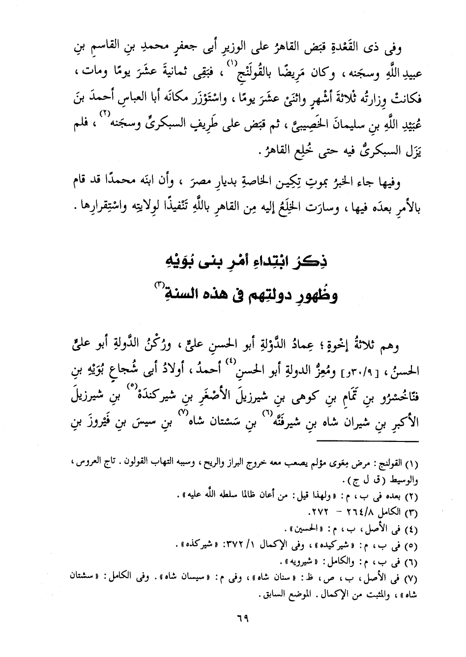 وَهُمْ ثَلَاثَةُ إِخْوَةٍ ; عِمَادُ الدَّوْلَةِ أَبُو الْحَسَنِ عَلِيٌّ، وَرُكْنُ الدَّوْلَةِ أَبُو عَلِيٍّ الْحَسَنُ، وَمُعِزُّ الدَّوْلَةِ أَبُو الْحَسَنِ أَحْمَدُ، أَوْلَادُ أَبِي شُجَاعٍ بُوَيْهِ بْنِ فَنَّاخُسْرُو بْنِ تَمَّامِ بْنِ كُوهَى بْنِ شِيرِزِيلَ الْأَصْغَرِ بْنِ شِيرِكِنْدَةَ بْنِ شِيرِزِيلَ الْأَكْبَرِ بْنِ شِيرَانَ شَاهِ بْنِ شِيرَفَنَّهِ بْنِ سَسْتَانَ شَاهَ بْنِ سِيسَ بْنِ فَيْرُوزَ بْنِ