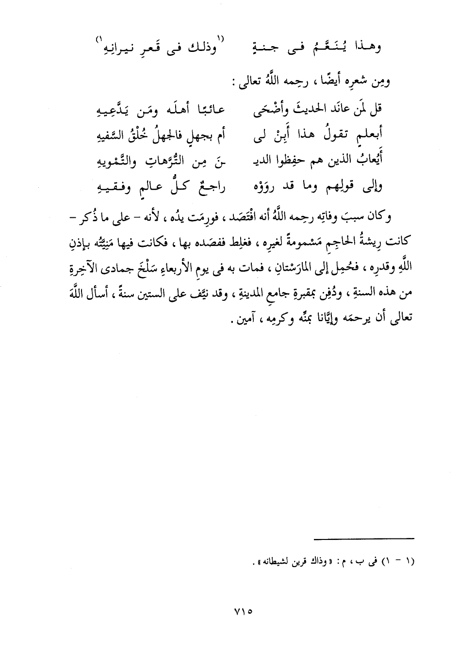 وَكَانَ سَبَبُ وَفَاتِهِ رَحِمَهُ اللَّهُ أَنَّهُ افْتَصَدَ، فَوَرِمَتْ يَدُهُ ; لِأَنَّهُ - عَلَى مَا ذُكِرَ - كَانَتْ رِيشَةُ الْحَاجِمِ مَسْمُومَةً لِغَيْرِهِ، فَغَلِطَ، فَفَصَدَهُ بِهَا، فَكَانَتْ فِيهَا مَنِيَّتُهُ بِإِذْنِ اللَّهِ وَقَدَرِهِ، فَحُمِلَ إِلَى الْمَارَسْتَانِ، فَمَاتَ بِهِ فِي يَوْمِ الْأَرْبِعَاءِ سَلْخِ جُمَادَى الْآخِرَةِ مِنْ هَذِهِ السَّنَةِ، وَدُفِنَ بِمَقْبَرَةِ جَامِعِ الْمَدِينَةِ وَقَدْ نَيَّفَ عَلَى السِّتِّينَ سَنَةً، أَسْأَلُ اللَّهَ تَعَالَى أَنْ يَرْحَمَهُ وَإِيَّانَا بِمَنِّهِ وَكَرَمِهِ، آمِينَ.