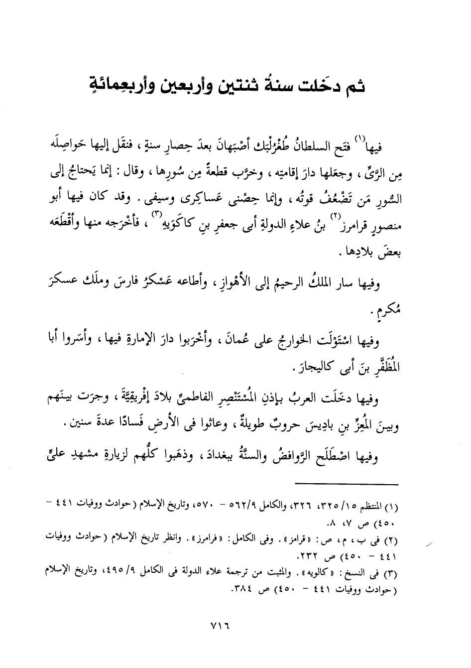 [ثُمَّ دَخَلَتْ سَنَةُ ثِنْتَيْنِ وَأَرْبَعِينَ وَأَرْبَعِمِائَةٍ]