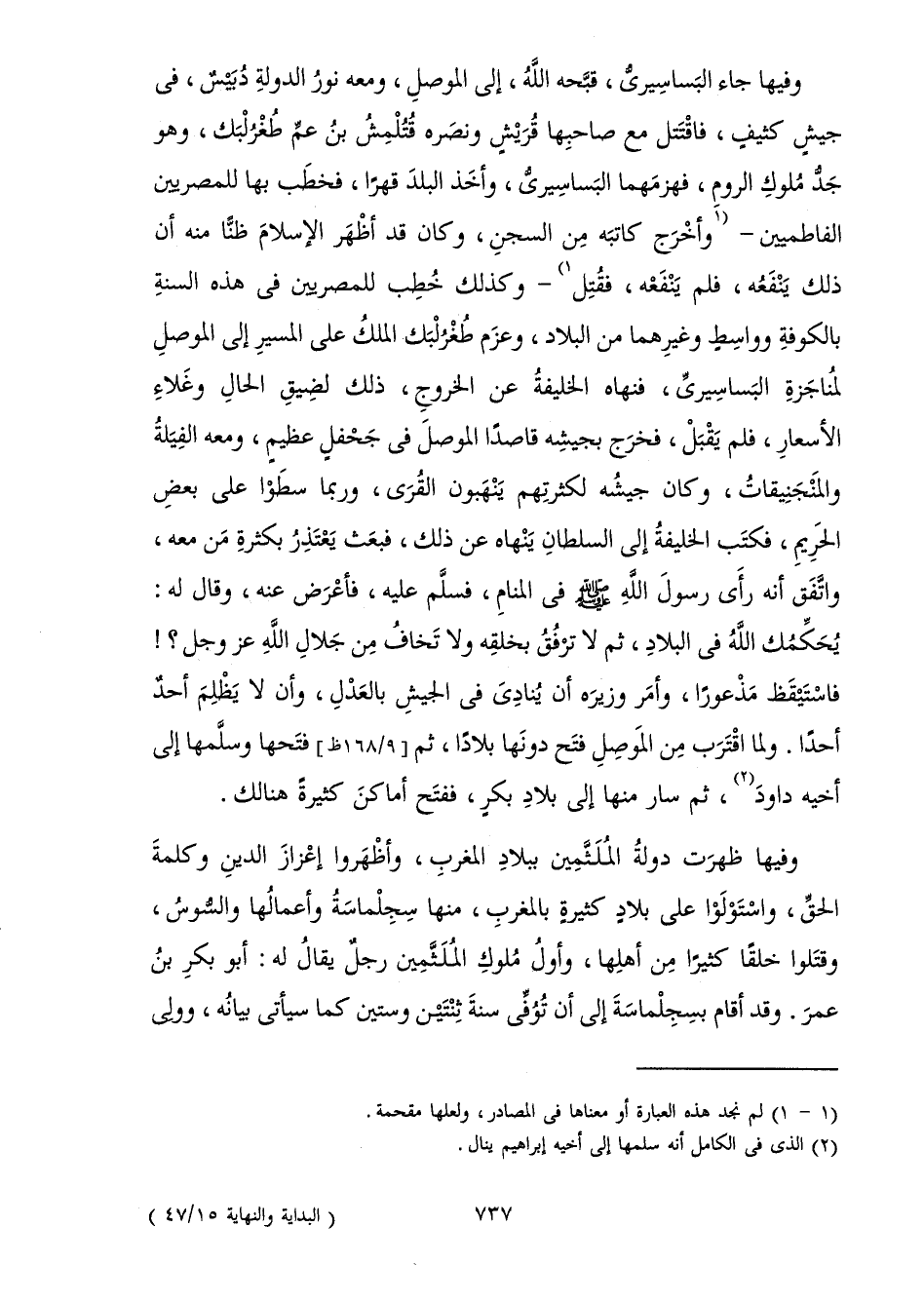 وَفِيهَا جَاءَ الْبَسَاسِيرِيُّ - قَبَّحَهُ اللَّهُ - إِلَى الْمَوْصِلِ وَمَعَهُ نُورُ الدَّوْلَةِ دُبَيْسُ، فِي جَيْشٍ كَثِيفٍ، فَاقْتَتَلَ مَعَ صَاحِبِهَا قُرَيْشٍ وَنَصَرَهُ قُتُلْمِشُ ابْنُ عَمِّ طُغْرُلْبَكَ وَهُوَ جَدُّ مُلُوكِ الرُّومِ، فَهَزَمَهُمَا الْبَسَاسِيرِيُّ، وَأَخَذَ الْبَلَدَ قَهْرًا، فَخَطَبَ بِهَا لِلْمِصْرِيِّينَ الْفَاطِمِيِّينَ، وَأَخْرَجَ كَاتِبَهُ مِنَ السِّجْنِ - وَكَانَ قَدْ أَظْهَرَ الْإِسْلَامَ ظَنًّا مِنْهُ أَنَّ ذَلِكَ يَنْفَعُهُ، فَلَمْ يَنْفَعْهُ، فَقُتِلَ - وَكَذَلِكَ خُطِبَ لِلْمِصْرِيِّينَ فِي هَذِهِ السَّنَةِ بِالْكُوفَةِ وَوَاسِطٍ وَغَيْرِهِمَا مِنَ الْبِلَادِ، وَعَزَمَ طُغْرُلْبَكُ الْمَلِكُ عَلَى الْمَسِيرِ إِلَى الْمَوْصِلِ لِمُنَاجَزَةِ الْبَسَاسِيرِيِّ، فَنَهَاهُ الْخَلِيفَةُ عَنِ الْخُرُوجِ، ذَلِكَ لِضِيقِ الْحَالِ وَغَلَاءِ الْأَسْعَارِ، فَلَمْ يَقْبَلْ، فَخَرَجَ بِجَيْشِهِ قَاصِدًا الْمَوْصِلَ فِي جَحْفَلٍ عَظِيمَةٍ، وَمَعَهُ الْفِيَلَةُ وَالْمَنْجَنِيقَاتُ، وَكَانَ جَيْشُهُ لِكَثْرَتِهِمْ يَنْهَبُونَ الْقُرَى، وَرُبَّمَا سَطَوْا عَلَى بَعْضِ الْحَرِيمِ، فَكَتَبَ الْخَلِيفَةُ إِلَى السُّلْطَانِ يَنْهَاهُ عَنْ ذَلِكَ، فَبَعَثَ يَعْتَذِرُ بِكَثْرَةِ مَنْ مَعَهُ، وَاتَّفَقَ أَنَّهُ رَأَى رَسُولَ اللَّهِ صَلَّى اللَّهُ عَلَيْهِ وَسَلَّمَ فِي الْمَنَامِ، فَسَلَّمَ عَلَيْهِ، فَأَعْرَضُ عَنْهُ، وَقَالَ لَهُ: يُحَكِّمُكَ اللَّهُ فِي الْبِلَادِ، ثُمَّ لَا تَرْفُقُ بِخَلْقِهِ وَلَا تَخَافُ مِنْ جَلَالِ اللَّهِ عَزَّ وَجَلَّ؟! فَاسْتَيْقَظَ مَذْعُورًا، وَأَمَرَ وَزِيرَهُ أَنْ يُنَادِيَ فِي الْجَيْشِ بِالْعَدْلِ، وَأَنْ لَا يَظْلِمَ أَحَدٌ أَحَدًا. وَلَمَّا اقْتَرَبَ مِنَ الْمَوْصِلِ فَتَحَ دُونَهَا بِلَادًا، ثُمَّ فَتَحَهَا وَسَلَّمَهَا إِلَى أَخِيهِ دَاوُدَ، ثُمَّ سَارَ مِنْهَا إِلَى بِلَادِ بَكْرٍ، فَفَتَحَ أَمَاكِنَ كَثِيرَةً هُنَالِكَ.