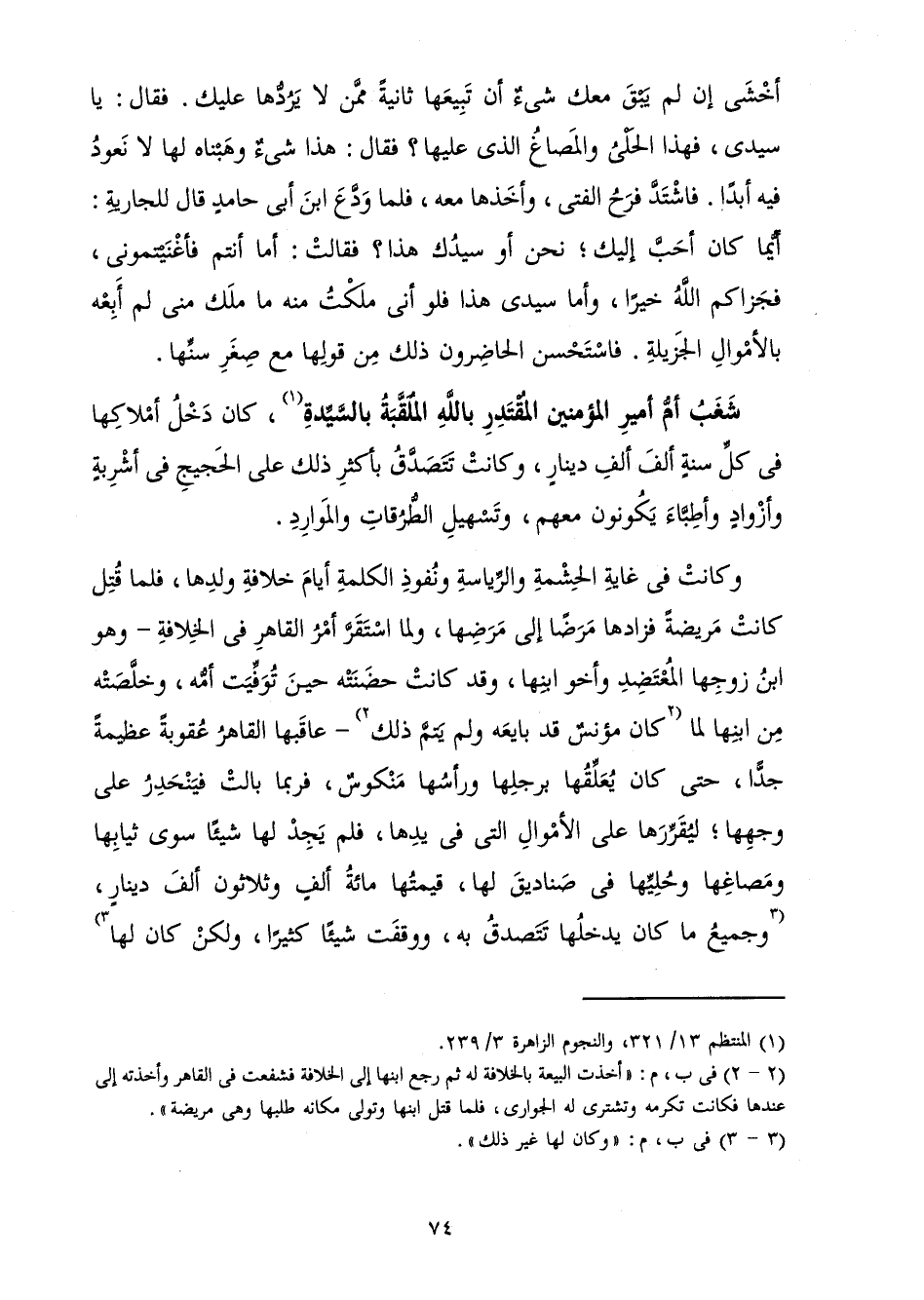وَكَانَتْ فِي غَايَةِ الْحِشْمَةِ وَالرِّيَاسَةِ وَنُفُوذِ الْكَلِمَةِ أَيَّامَ خِلَافَةِ وَلَدِهَا، فَلَمَّا قُتِلَ كَانَتْ مَرِيضَةً فَزَادَهَا مَرَضًا إِلَى مَرَضِهَا، وَلَمَّا اسْتَقَرَّ أَمْرُ الْقَاهِرِ فِي الْخِلَافَةِ - وَهُوَ ابْنُ زَوْجِهَا الْمُعْتَضِدِ وَأَخُو ابْنِهَا، وَقَدْ كَانَتْ حَضَنَتْهُ حِينَ تُوُفِّيَتْ أُمُّهُ، وَخَلَّصَتْهُ مِنَ ابْنِهَا لَمَّا كَانَ مُؤْنِسٌ قَدْ بَايَعَهُ وَلَمْ يَتِمَّ ذَلِكَ - عَاقَبَهَا الْقَاهِرُ عُقُوبَةً عَظِيمَةً جِدًّا، حَتَّى كَانَ يُعَلِّقُهَا بِرِجْلِهَا وَرَأْسُهَا مَنْكُوسٌ، فَرُبَّمَا بَالَتْ، فَيَنْحَدِرُ عَلَى وَجْهِهَا ; لِيُقَرِّرَهَا عَلَى الْأَمْوَالِ الَّتِي فِي يَدِهَا، فَلَمْ يَجِدْ لَهَا شَيْئًا سِوَى ثِيَابِهَا وَمَصَاغِهَا وَحُلِيِّهَا فِي صَنَادِيقَ لَهَا، قِيمَتُهَا مِائَةُ أَلْفٍ وَثَلَاثُونَ أَلْفَ دِينَارٍ، وَجَمِيعُ مَا كَانَ يَدْخُلُهَا تَتَصَدَّقُ بِهِ، وَوَقَفَتْ شَيْئًا كَثِيرًا، وَلَكِنْ كَانَ لَهَا