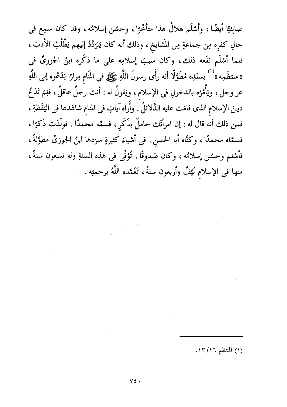 صَابِئِيًا أَيْضًا، وَأَسْلَمَ هِلَالٌ هَذَا مُتَأَخِّرًا، وَحَسُنَ إِسْلَامُهُ، وَقَدْ كَانَ سَمِعَ فِي حَالِ كَفْرِهِ مِنْ جَمَاعَةٍ مِنَ الْمَشَايِخِ، وَذَلِكَ أَنَّهُ كَانَ يَتَرَدَّدُ إِلَيْهِمْ يَطْلُبُ الْأَدَبَ، فَلَمَّا أَسْلَمْ نَفَعَهُ ذَلِكَ، وَكَانَ سَبَبَ إِسْلَامِهِ عَلَى مَا ذَكَرَهُ ابْنُ الْجَوْزِيِّ فِي " مُنْتَظَمِهِ " بِسَنَدِهِ مُطَوَّلًا: أَنَّهُ رَأَى رَسُولَ اللَّهِ صَلَّى اللَّهُ عَلَيْهِ وَسَلَّمَ فِي الْمَنَامِ مِرَارًا يَدْعُوهُ إِلَى اللَّهِ عَزَّ وَجَلَّ، وَيَأْمُرُهُ بِالدُّخُولِ فِي الْإِسْلَامِ، وَيَقُولُ لَهُ: أَنْتَ رَجُلٌ عَاقِلٌ، فَلِمَ تَدَعُ دِينَ الْإِسْلَامِ الَّذِي قَامَتْ عَلَيْهِ الدَّلَائِلُ. وَأَرَاهُ آيَاتٍ فِي الْمَنَامِ شَاهَدَهَا فِي الْيَقَظَةِ، فَمِنْ ذَلِكَ أَنَّهُ قَالَ لَهُ: إِنَّ امْرَأَتَكَ حَامِلٌ بِذَكَرٍ، فَسَمِّهِ مُحَمَّدًا، فَوَلَدَتْ ذَكَرًا، فَسَمَّاهُ مُحَمَّدًا، وَكَنَّاهُ أَبَا الْحَسَنِ. وَفِي أَشْيَاءَ كَثِيرَةٍ سَرَدَهَا ابْنُ الْجَوْزِيِّ مُطَوَّلَةً، فَأَسْلَمَ وَحَسُنَ إِسْلَامُهُ، وَكَانَ صَدُوقًا. تُوُفِّيَ فِي هَذِهِ السَّنَةِ وَلَهُ تِسْعُونَ سَنَةً، فِي الْإِسْلَامِ نَيِّفٌ وَأَرْبَعُونَ سَنَةً، تَغَمَّدَهُ اللَّهُ بِرَحْمَتِهِ.