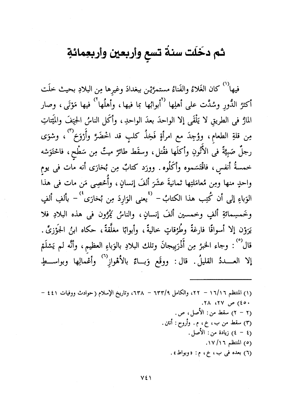 ٍ فِيهَا كَانَ الْغَلَاءُ وَالْفَنَاءُ مُسْتَمِرَّيْنِ بِبَغْدَادَ وَغَيْرِهَا مِنَ الْبِلَادِ بِحَيْثُ خَلَتْ أَكْثَرُ الدُّورِ وَسُدَّتْ عَلَى أَهْلِهَا أَبْوَابُهَا بِمَا فِيهَا، وَأَهْلُهَا فِيهَا مَوْتَى، وَصَارَ الْمَارُّ فِي الطَّرِيقِ لَا يَلْقَى إِلَّا الْوَاحِدَ بَعْدَ الْوَاحِدِ، وَأَكَلَ النَّاسُ الْجِيَفَ وَالْمِيَاتَ مِنْ قِلَّةِ الطَّعَامِ، وَوُجِدَ مَعَ امْرَأَةٍ فَخْذُ كَلْبٍ قَدِ اخْضَرَّ وَأَرْوَحَ، وَشَوَى رَجُلٌ صَبِيَّةً فِي الْأَتُونِ وَأَكَلَهَا فَقُتِلَ، وَسَقَطَ طَائِرٌ مَيِّتٌ مِنْ سَطْحٍ، فَاحْتَوَشَهُ خَمْسَةُ أَنْفُسٍ، فَاقْتَسَمُوهُ وَأَكَلُوهُ. وَوَرَدَ كِتَابٌ مِنْ بُخَارَى أَنَّهُ مَاتَ فِي يَوْمٍ وَاحِدٍ مِنْهَا وَمِنْ مُعَامَلَتِهَا ثَمَانِيَةَ عَشَرَ أَلْفَ إِنْسَانٍ، وَأُحْصِيَ مَنْ مَاتَ فِي هَذَا الْوَبَاءِ إِلَى أَنْ كُتِبَ هَذَا الْكِتَابُ - يَعْنِي الْوَارِدَ مِنْ بُخَارَى - بِأَلْفِ أَلْفٍ وَخَمْسِمِائَةِ أَلْفٍ وَخَمْسِينَ أَلْفَ إِنْسَانٍ، وَالنَّاسُ يَمُرُّونَ فِي هَذِهِ الْبِلَادِ، فَلَا يَرَوْنَ إِلَّا أَسْوَاقًا فَارِغَةً وَطُرُقَاتٍ خَالِيَةً، وَأَبْوَابًا مُغْلَقَةً، حَكَاهُ ابْنُ الْجَوْزِيِّ. قَالَ: وَجَاءَ الْخَبَرُ مِنْ أَذْرَبِيجَانَ وَتِلْكَ الْبِلَادِ بِالْوَبَاءِ الْعَظِيمِ، وَأَنَّهُ لَمْ يَسْلَمْ إِلَّا الْعَدَدُ الْقَلِيلُ: وَوَقَعَ وَبَاءٌ بِالْأَهْوَازِ وَأَعْمَالِهَا وَبِوَاسِطٍ