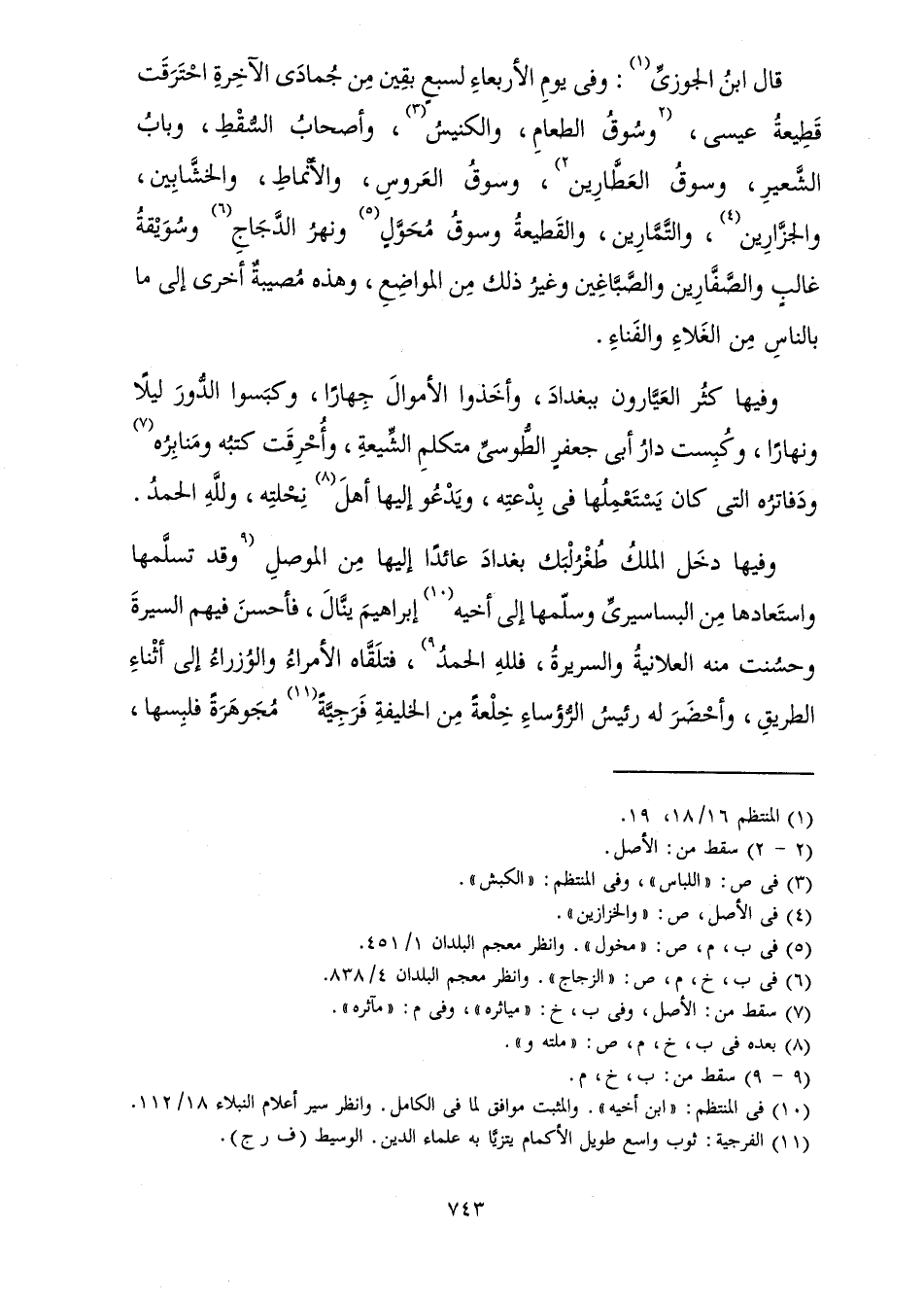 وَفِيهَا كَثُرَ الْعَيَّارُونَ بِبَغْدَادَ، وَأَخَذُوا الْأَمْوَالَ جِهَارًا، وَكَبَسُوا الدُّورَ لَيْلًا وَنَهَارًا، وَكُبِسَتْ دَارُ أَبِي جَعْفَرٍ الطُّوسِيِّ مُتَكَلِّمِ الشِّيعَةِ، وَأُحْرِقَتْ كُتُبُهُ وَمَنَابِرُهُ وَدَفَاتِرُهُ الَّتِي كَانَ يَسْتَعْمِلُهَا فِي بِدْعَتِهِ، وَيَدْعُو إِلَيْهَا أَهْلَ نِحْلَتِهِ، وَلِلَّهِ الْحَمْدُ.