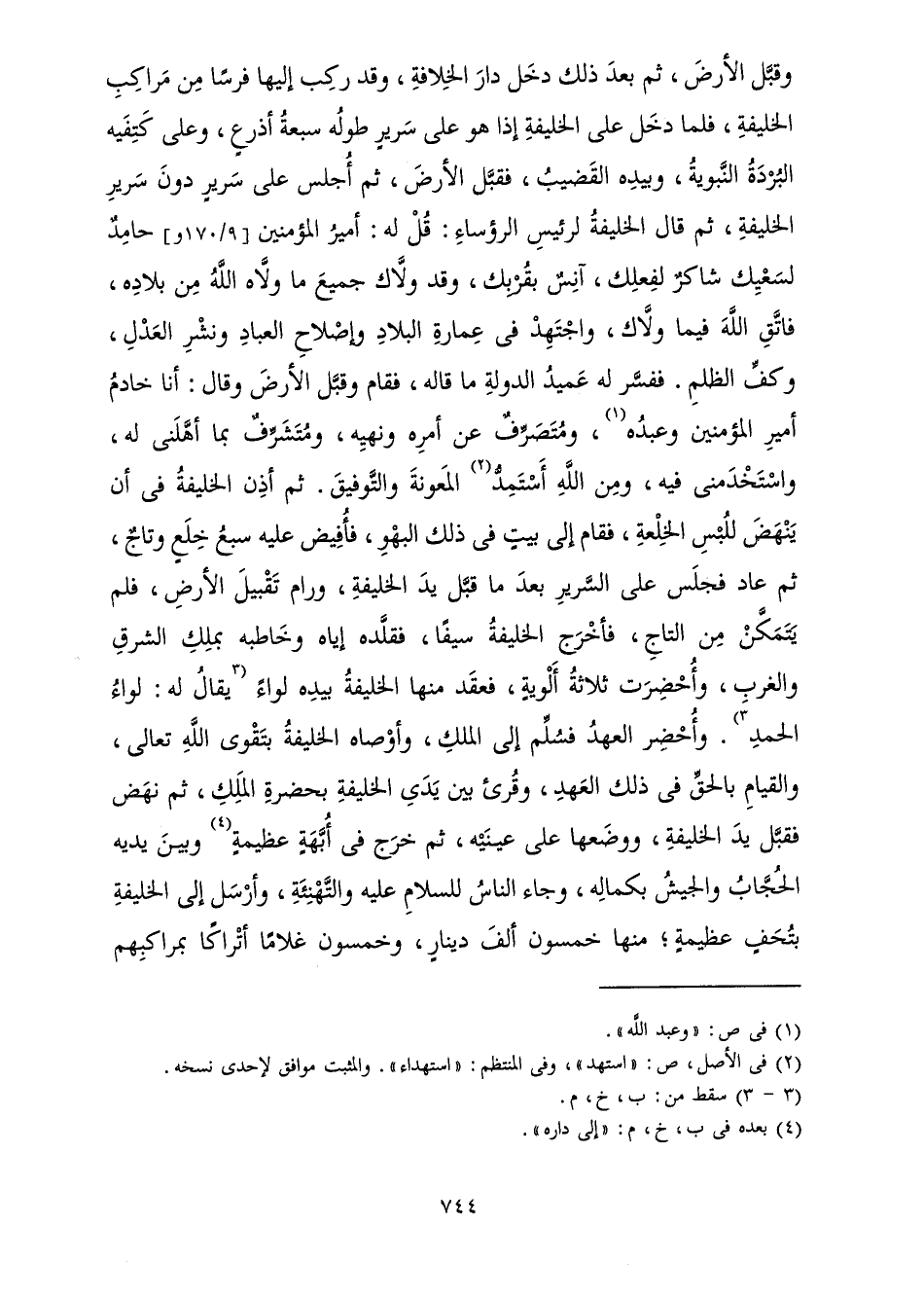 وَقَبَّلَ الْأَرْضَ، ثُمَّ بَعْدَ ذَلِكَ دَخَلَ دَارَ الْخِلَافَةِ، وَقَدْ رَكِبَ إِلَيْهَا فَرَسًا مِنْ مَرَاكِبِ الْخَلِيفَةِ، فَلَمَّا دَخَلَ عَلَى الْخَلِيفَةِ إِذَا هُوَ عَلَى سَرِيرٍ طُولُهُ سَبْعَةُ أَذْرُعٍ، وَعَلَى كَتِفَيْهِ الْبُرْدَةُ النَّبَوِيَّةُ، وَبِيَدِهِ الْقَضِيبُ، فَقَبَّلَ الْأَرْضَ، ثُمَّ أُجْلِسَ عَلَى سَرِيرٍ دُونَ سَرِيرِ الْخَلِيفَةِ، ثُمَّ قَالَ الْخَلِيفَةُ لِرَئِيسِ الرُّؤَسَاءِ: قُلْ لَهُ: أَمِيرُ الْمُؤْمِنِينَ حَامِدٌ لِسَعْيِكَ، شَاكِرٌ لِفِعْلِكَ، آنِسٌ بِقُرْبِكَ، وَقَدْ وَلَّاكَ جَمِيعَ مَا وَلَّاهُ اللَّهُ مِنْ بِلَادِهِ، فَاتَّقِ اللَّهَ فِيمَا وَلَّاكَ، وَاجْتَهِدْ فِي عِمَارَةِ الْبِلَادِ، وَإِصْلَاحِ الْعِبَادِ، وَنَشْرِ الْعَدْلِ، وَكَفِّ الظُّلْمِ. فَفَسَّرَ لَهُ عَمِيدُ الدَّوْلَةِ مَا قَالَهُ، فَقَامَ وَقَبَّلَ الْأَرْضَ وَقَالَ: أَنَا خَادِمُ أَمِيرِ الْمُؤْمِنِينَ وَعَبْدُهُ، وَمُتَصَرِّفٌ عَنْ أَمْرِهِ وَنَهْيِهِ، وَمُتَشَرِّفٌ بِمَا أَهَّلَنِي لَهُ، وَاسْتَخْدَمَنِي فِيهِ، وَمِنَ اللَّهِ أَسْتَمِدُّ الْمَعُونَةَ وَالتَّوْفِيقَ. ثُمَّ أَذِنَ الْخَلِيفَةُ فِي أَنْ يَنْهَضَ لِلُبْسِ الْخِلْعَةَ، فَقَامَ إِلَى بَيْتٍ فِي ذَلِكَ الْبَهْوِ، فَأُفِيضَ عَلَيْهِ سَبْعُ خِلَعٍ وَتَاجٌ، ثُمَّ عَادَ فَجَلَسَ عَلَى السَّرِيرِ بَعْدَ مَا قَبَّلَ يَدَ الْخَلِيفَةِ، وَرَامَ تَقْبِيلَ الْأَرْضِ، فَلَمْ يَتَمَكَّنْ مِنَ التَّاجِ، فَأَخْرَجَ الْخَلِيفَةُ سَيْفًا فَقَلَّدَهُ إِيَّاهُ وَخَاطَبَهُ بِمَلِكِ الشَّرْقِ وَالْغَرْبِ، وَأُحْضِرَتْ ثَلَاثَةُ أَلْوِيَةٍ، فَعَقَدَ مِنْهَا الْخَلِيفَةُ بِيَدِهِ لِوَاءً يُقَالُ لَهُ: لِوَاءُ الْحَمْدِ، وَأُحْضِرَ الْعَهْدُ فَسُلِّمَ إِلَى الْمَلِكِ، وَأَوْصَاهُ الْخَلِيفَةُ بِتَقْوَى اللَّهِ تَعَالَى، وَالْقِيَامِ بِالْحَقِّ فِي ذَلِكَ الْعَهْدِ، وَقُرِئَ بَيْنَ يَدَيِ الْخَلِيفَةِ بِحَضْرَةِ الْمَلِكِ، ثُمَّ نَهَضَ فَقَبَّلَ يَدَ الْخَلِيفَةِ، وَوَضَعَهَا عَلَى عَيْنَيْهِ، ثُمَّ خَرَجَ فِي أُبَّهَةٍ عَظِيمَةٍ، وَبَيْنَ يَدَيْهِ الْحِجَابُ وَالْجَيْشُ بِكَمَالِهِ، وَجَاءَ النَّاسُ لِلسَّلَامِ عَلَيْهِ وَالتَّهْنِئَةِ، وَأَرْسَلَ إِلَى الْخَلِيفَةِ بِتُحَفٍ عَظِيمَةٍ ; مِنْهَا خَمْسُونَ أَلْفَ دِينَارٍ، وَخَمْسُونَ غُلَامًا أَتْرَاكًا بِمَرَاكِبِهِمْ