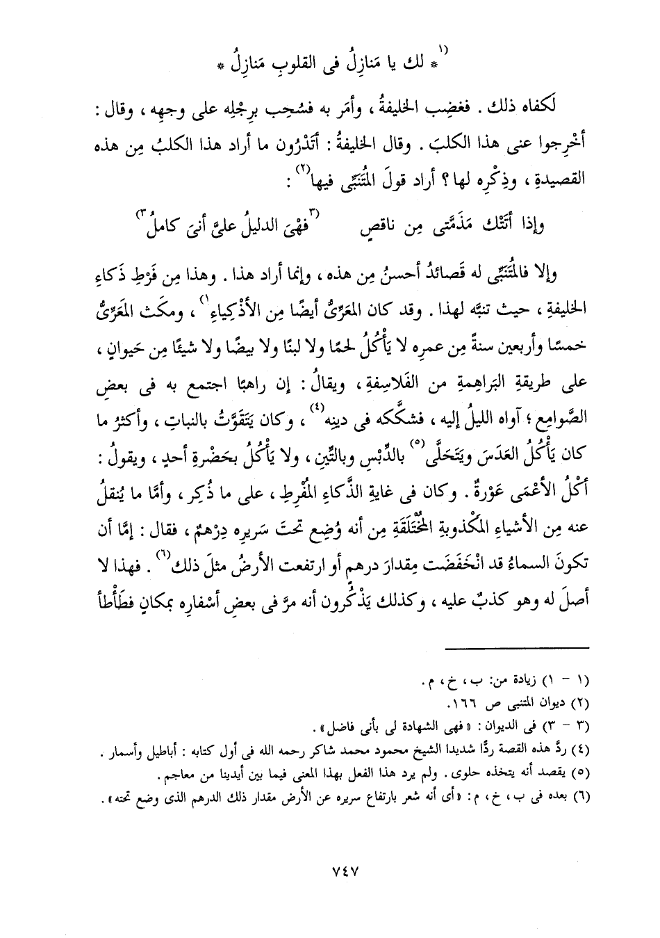 وَإِلَّا فَالْمُتَنَبِّي لَهُ قَصَائِدُ أَحْسَنُ مِنْ هَذِهِ، وَإِنَّمَا أَرَادَ هَذَا. وَهَذَا مِنْ فَرْطِ ذَكَاءِ الْخَلِيفَةِ، حَيْثُ تَنَبَّهَ لِهَذَا.