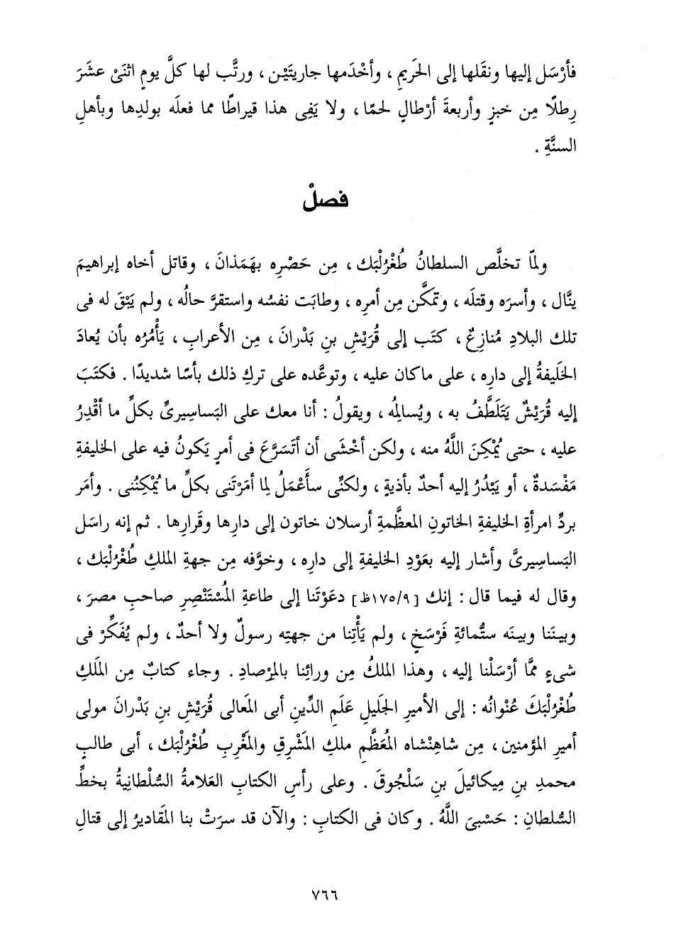 وَلَمَّا تَخَلَّصَ السُّلْطَانُ طُغْرُلْبَكُ مِنْ حَصْرِهِ بِهَمَذَانَ، وَقَاتَلَ أَخَاهُ إِبْرَاهِيمَ، وَأَسَرَهُ وَقَتَلَهُ، وَتَمَكَّنَ مِنْ أَمْرِهِ، وَطَابَتْ نَفْسُهُ، وَاسْتَقَرَّ حَالُهُ، وَلَمْ يَبْقَ لَهُ فِي تِلْكَ الْبِلَادِ مُنَازِعٌ، كَتَبَ إِلَى قُرَيْشِ بْنِ بَدْرَانَ، مِنَ الْأَعْرَابِ، يَأْمُرُهُ بِأَنْ يُعَادَ الْخَلِيفَةُ إِلَى دَارِهِ، عَلَى مَا كَانَ عَلَيْهِ، وَتَوَعَّدَهُ عَلَى تَرْكِ ذَلِكَ بَأْسًا شَدِيدًا، فَكَتَبَ إِلَيْهِ قُرَيْشٌ يَتَلَطَّفُ بِهِ، وَيُسَالِمُهُ، وَيَقُولُ: أَنَا مَعَكَ عَلَى الْبَسَاسِيرِيِّ بِكُلِّ مَا أَقْدِرُ عَلَيْهِ، حَتَّى يُمَكِّنَ اللَّهُ مِنْهُ، وَلَكِنْ أَخْشَى أَنْ أَتَسَرَّعَ فِي أَمْرٍ يَكُونُ فِيهِ عَلَى الْخَلِيفَةِ مَفْسَدَةٌ، أَوْ يَبْدُرَ إِلَيْهِ أَحَدٌ بِأَذِيَّةٍ، وَلَكِنِّي سَأَعْمَلُ لِمَا أَمَرْتَنِي بِكُلِّ مَا يُمْكِنُنِي. وَأَمَرَ بِرَدِّ امْرَأَةِ الْخَلِيفَةِ الْخَاتُونِ الْمُعَظَّمَةِ أَرْسَلَانَ خَاتُونَ إِلَى دَارِهَا وَقَرَارِهَا. ثُمَّ إِنَّهُ رَاسَلَ الْبَسَاسِيرِيَّ، وَأَشَارَ إِلَيْهِ بِعَوْدِ الْخَلِيفَةِ إِلَى دَارِهِ، وَخَوْفِهِ مِنْ جِهَةِ الْمَلِكِ طُغْرُلْبَكَ، وَقَالَ لَهُ فِيمَا قَالَ: إِنَّكَ دَعَوْتَنَا إِلَى طَاعَةِ الْمُسْتَنْصِرِ صَاحِبِ مِصْرَ، وَبَيْنَنَا وَبَيْنَهُ سِتُّمِائَةِ فَرْسَخٍ، وَلَمْ يَأْتِنَا مِنْ جِهَتِةِ رَسُولٌ وَلَا أَحَدٌ، وَلَمْ يُفَكِّرْ فِي شَيْءٍ مِمَّا أَرْسَلْنَا إِلَيْهِ، وَهَذَا الْمَلِكُ مِنْ وَرَائِنَا بِالْمِرْصَادِ. وَجَاءَ كِتَابٌ مِنَ الْمَلِكِ طُغْرُلْبَكَ عُنْوَانُهُ: إِلَى الْأَمِيرِ الْجَلِيلِ عَلَمِ الدِّينِ أَبِي الْمَعَالِي قُرَيْشِ بْنِ بَدْرَانَ مَوْلَى أَمِيرِ الْمُؤْمِنِينَ، مِنْ شَاهِنْشَاهَ الْمُعْظَّمِ مَلِكِ الْمَشْرِقِ وَالْمَغْرِبِ طُغْرُلْبَكَ أَبِي طَالِبٍ مُحَمَّدِ بْنِ مِيكَائِيلَ بْنِ سَلْجُوقَ. وَعَلَى رَأْسِ الْكِتَابِ الْعَلَامَةُ السُّلْطَانِيَّةُ بِخَطِّ السُّلْطَانِ: حَسْبِي اللَّهُ. وَكَانَ فِي الْكِتَابِ: وَالْآنَ قَدْ سَرَتْ بِنَا الْمَقَادِيرُ إِلَى قِتَالِ