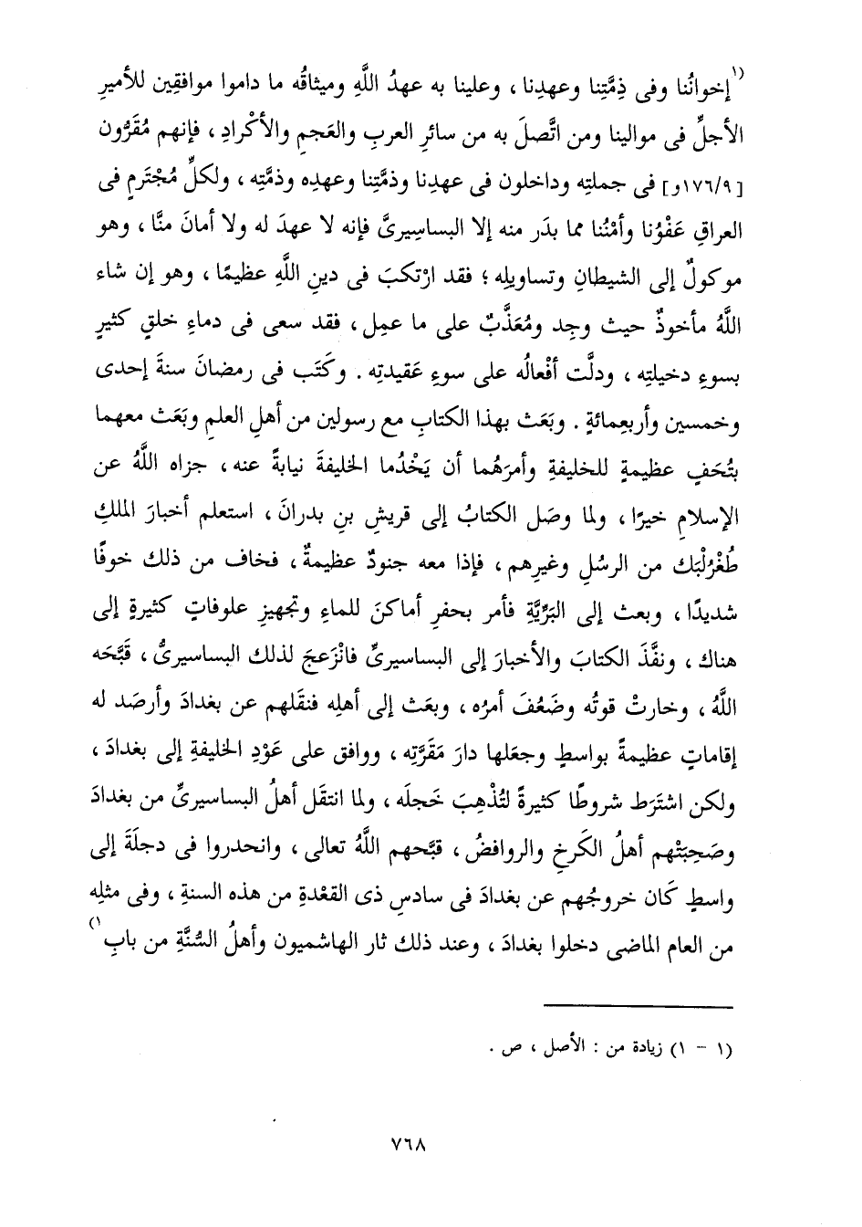 إِخْوَانُنَا وَفِي ذِمَّتِنَا وَعَهْدِنَا، وَعَلَيْنَا بِهِ عَهْدُ اللَّهِ وَمِيثَاقُهُ مَا دَامُوا مُوَافِقِينَ لِلْأَمِيرِ الْأَجَلِّ فِي مَوَالِينَا وَمَنِ اتَّصَلَ بِهِ مِنْ سَائِرِ الْعَرَبِ وَالْعَجَمِ وَالْأَكْرَادِ، فَإِنَّهُمْ مُقِرُّونَ وَفِي جُمْلَتِهِ دَاخِلُونَ فِي عَهْدِنَا وَذِمَّتِنَا وَعَهْدِهِ وَذِمَّتِهِ، وَلِكُلِّ مُجْتَرِمٍ فِي الْعِرَاقِ عَفْوُنَا وَأَمْنُنَا مِمَّا بَدَرَ مِنْهُ إِلَّا الْبَسَاسِيرِيَّ، فَإِنَّهُ لَا عَهْدَ لَهُ وَلَا أَمَانَ مِنَّا، وَهُوَ مَوْكُولٌ إِلَى الشَّيْطَانِ وَتَسَاوِيلِهِ ; فَقَدِ ارْتَكَبَ فِي دِينِ اللَّهِ عَظِيمًا، وَهُوَ إِنْ شَاءَ اللَّهُ مَأْخُوذٌ حَيْثُ وُجِدَ وَمُعَذَّبٌ عَلَى مَا عَمِلَ، فَقَدْ سَعَى فِي دِمَاءِ خَلْقٍ كَثِيرٍ بِسُوءِ دَخِيلَتِهِ، وَدَلَّتْ أَفْعَالُهُ عَلَى سُوءِ عَقِيدَتِهِ. وَكَتَبَ فِي رَمَضَانَ سَنَةَ إِحْدَى وَخَمْسِينَ وَأَرْبَعِمِائَةٍ.