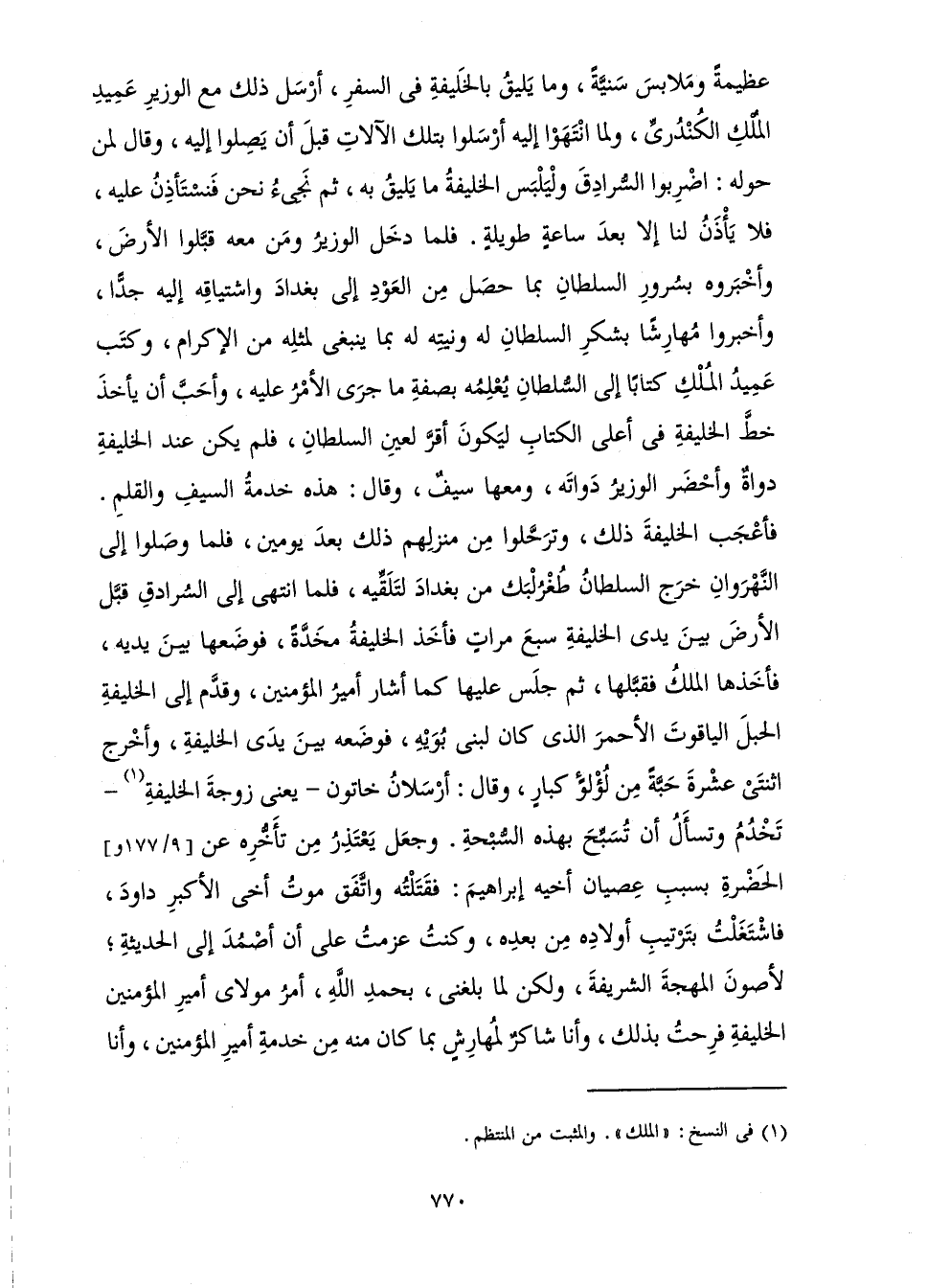 وَتَرْحَّلُوا مِنْ مَنْزِلِهِمْ ذَلِكَ بَعْدَ يَوْمَيْنِ، فَلَمَّا وَصَلُوا إِلَى النَّهْرَوَانِ خَرَجَ السُّلْطَانُ طُغْرُلْبَكَ مِنْ بَغْدَادَ لِتَلَقِّيهِ، فَلَمَّا انْتَهَى إِلَى السُّرَادِقِ قَبَّلَ الْأَرْضَ بَيْنَ يَدَيِ الْخَلِيفَةِ سَبْعَ مَرَّاتٍ، فَأَخَذَ الْخَلِيفَةُ مِخَدَّةً، فَوَضَعَهَا بَيْنَ يَدَيْهِ، فَأَخَذَهَا الْمَلِكُ فَقَبَّلَهَا، ثُمَّ جَلَسَ عَلَيْهَا، كَمَا أَشَارَ أَمِيرُ الْمُؤْمِنِينَ، وَقَدَّمَ إِلَى الْخَلِيفَةِ الْحَبْلَ الْيَاقُوتَ الْأَحْمَرَ الَّذِي كَانَ لِبَنِي بُوَيْهِ، فَوَضَعَهُ بَيْنَ يَدَيِ الْخَلِيفَةِ، وَأَخْرَجَ اثْنَتَيْ عَشْرَةَ حَبَّةً مِنْ لُؤْلُؤٍ كِبَارٍ، وَقَالَ: أَرْسَلَانُ خَاتُونَ - يَعْنِي زَوْجَةَ الْخَلِيفَةِ - تَخْدُمُ وَتَسْأَلُ أَنْ تُسَبِّحَ بِهَذِهِ السُّبْحَةِ، وَجَعَلَ يَعْتَذِرُ مِنْ تَأَخُّرِهِ عَنِ الْحَضْرَةِ بِسَبَبِ عِصْيَانِ أَخِيهِ إِبْرَاهِيمَ، فَقَتَلْتُهُ، وَاتَّفَقَ مَوْتُ أَخِي الْأَكْبَرِ دَاوُدَ، فَاشْتَغَلْتُ بِتَرْتِيبِ أَوْلَادِهِ مِنْ بَعْدِهِ، وَكُنْتُ عَزَمْتُ عَلَى أَنْ أَصْمُدَ إِلَى الْحَدِيثَةِ ; لِأَصُونَ الْمُهْجَةَ الشَّرِيفَةَ، وَلَكِنْ لَمَّا بَلَغَنِي، بِحَمْدِ اللَّهِ، أَمْرُ مَوْلَايَ أَمِيرِ الْمُؤْمِنِينَ الْخَلِيفَةِ، فَرِحْتُ بِذَلِكَ وَأَنَا شَاكِرٌ لِمُهَارِشٍ بِمَا كَانَ مِنْهُ مِنْ خِدْمَةِ أَمِيرِ الْمُؤْمِنِينَ، وَأَنَا