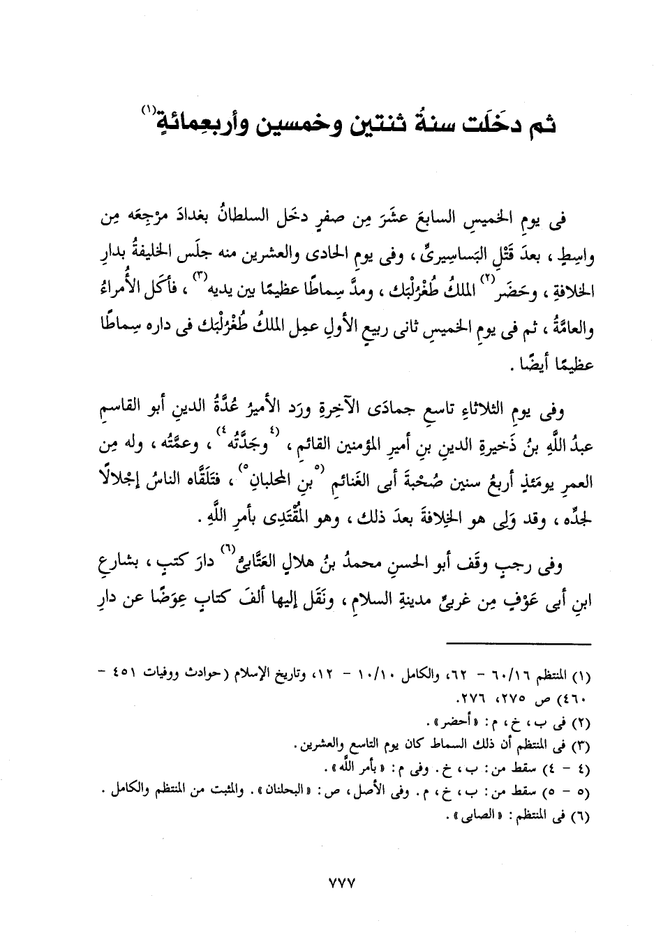 فِي يَوْمِ الْخَمِيسِ السَّابِعَ عَشَرَ مِنْ صَفَرٍ دَخَلَ السُّلْطَانُ بَغْدَادَ مَرْجِعَهُ مِنْ وَاسِطٍ بَعْدَ قَتْلِ الْبَسَاسِيرِيِّ، وَفِي يَوْمِ الْحَادِي وَالْعِشْرِينَ مِنْهُ جَلَسَ الْخَلِيفَةُ بِدَارِ الْخِلَافَةِ، وَحَضَرَ الْمَلِكُ طُغْرُلْبَكُ وَمَدَّ سِمَاطًا عَظِيمًا بَيْنَ يَدَيْهِ، فَأَكَلَ الْأُمَرَاءُ مِنْهُ وَالْعَامَّةُ، ثُمَّ فِي يَوْمِ الْخَمِيسِ ثَانِي رَبِيعٍ الْأَوَّلِ عَمِلَ الْمَلِكُ طُغْرُلْبَكُ فِي دَارِهِ سِمَاطًا عَظِيمًا أَيْضًا.