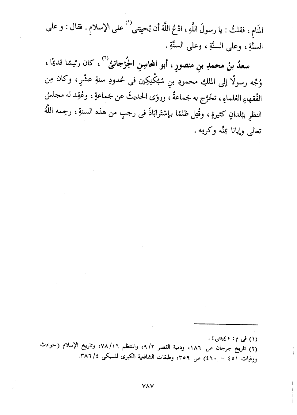 الْمَنَامِ، فَقُلْتُ: يَا رَسُولَ اللَّهِ، ادْعُ اللَّهَ أَنْ يُحْيِيَنِي عَلَى الْإِسْلَامِ. فَقَالَ: وَعَلَى السُّنَّةِ، وَعَلَى السُّنَّةِ، وَعَلَى السُّنَّةِ.