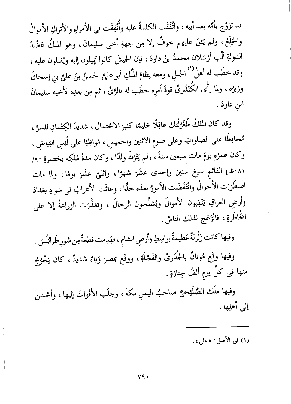 قَدْ تَزَوَّجَ بِأُمِّهِ بَعْدَ أَبِيهِ، وَاتَّفَقَتِ الْكَلِمَةُ عَلَيْهِ وَأُنْفِقَتْ فِي الْأُمَرَاءِ وَالْأَتْرَاكِ الْأَمْوَالُ وَالْخِلَعُ، وَلَمْ يَبْقَ عَلَيْهِمْ خَوْفٌ. إِلَّا مِنْ جِهَةِ أَخِي سُلَيْمَانَ، وَهُوَ الْمَلِكُ عَضُدِ الدَّوْلَةِ أَلْبُ أَرْسَلَانَ مُحَمَّدُ بْنُ دَاوُدَ، فَإِنَّ الْجَيْشَ كَانُوا يَمِيلُونَ إِلَيْهِ وَيُقْبِلُونَ عَلَيْهِ، وَقَدْ خَطَبَ لَهُ أَهْلُ الْجَبَلِ، وَمَعَهُ نِظَامُ الْمُلْكِ أَبُو عَلِيٍّ الْحَسَنُ بْنُ عَلِيِّ بْنِ إِسْحَاقَ وَزِيرُهُ، وَلَمَّا رَأَى الْكُنْدُرِيُّ قُوَّةَ أَمْرِهِ خَطَبَ لَهُ بِالرَّيِّ، ثُمَّ مِنْ بَعْدِهِ لِأَخِيهِ سُلَيْمَانَ بْنِ دَاوُدَ.