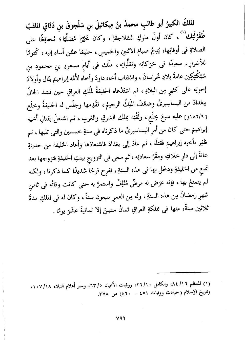 كَانَ أَوَّلُ مُلُوكِ السَّلَاجِقَةِ، وَكَانَ خَيِّرًا مُصَلِّيًا، مُحَافِظًا عَلَى الصَّلَاةِ فِي أَوْقَاتِهَا، يُدِيمُ صِيَامَ الِاثْنَيْنِ وَالْخَمِيسِ، حَلِيمًا عَمَّنْ أَسَاءَ إِلَيْهِ، كَتُومًا لِلْأَسْرَارِ، سَعِيدًا فِي حَرَكَاتِهِ وَتَقَلُّبَاتِهِ، مَلَكَ فِي أَيَّامِ مَسْعُودِ بْنِ مَحْمُودِ بْنِ سُبُكْتِكِينَ عَامَّةَ بِلَادِ خُرَاسَانَ وَاسْتَنَابَ أَخَاهُ دَاوُدَ وَأَخَاهُ لِأُمِّهِ إِبْرَاهِيمَ يَنَّالَ وَأَوْلَادَ إِخْوَتِهِ عَلَى كَثِيرٍ مِنَ الْبِلَادِ، ثُمَّ اسْتَدْعَاهُ الْخَلِيفَةُ لِمُلْكِ الْعِرَاقِ حِينَ فَسَدَ الْحَالُ بِبَغْدَادَ مِنَ الْبَسَاسِيرِيِّ وَضَعُفَ الْمَلِكُ الرَّحِيمُ، فَقَدِمَهَا وَجَلَسَ لَهُ الْخَلِيفَةُ وَخَلَعَ عَلَيْهِ سَبْعَ خِلَعٍ، وَلَقَّبَهُ بِمَلِكِ الشَّرْقِ وَالْغَرْبِ، ثُمَّ اشْتَغَلَ بِقِتَالِ أَخِيهِ إِبْرَاهِيمَ حَتَّى كَانَ مِنْ أَمْرِ الْبَسَاسِيرِيِّ مَا ذَكَرْنَاهُ فِي سَنَةِ خَمْسِينَ وَالَّتِي تَلِيهَا، ثُمَّ ظَفِرَ بِأَخِيهِ إِبْرَاهِيمَ فَقَتَلَهُ، ثُمَّ عَادَ إِلَى بَغْدَادَ فَاسْتَعَادَهَا وَأَعَادَ الْخَلِيفَةَ مِنْ حَدِيثَةِ عَانَةَ إِلَى دَارِ خِلَافَتِهِ وَمَقَرِّ سَعَادَتِهِ، ثُمَّ سَعَى فِي التَّزْوِيجِ بِبِنْتِ الْخَلِيفَةِ فَتَزَوَّجَهَا بَعْدَ تَمَنُّعٍ مِنَ الْخَلِيفَةِ، وَدَخَلَ بِهَا فِي هَذِهِ السَّنَةِ، فَفَرِحَ فَرَحًا شَدِيدًا كَمَا ذَكَرْنَا، وَلَكِنَّهُ لَمْ يَتَمَتَّعْ بِهَا، فَإِنَّهُ عَرَضَ لَهُ مَرَضٌ مُتْلِفٌ وَاسْتَمَرَّ بِهِ حَتَّى كَانَتْ وَفَاتُهُ فِي ثَامِنِ رَمَضَانَ مِنْ هَذِهِ السَّنَةِ، وَلَهُ مِنَ الْعُمُرِ سَبْعُونَ سَنَةً، وَكَانَ لَهُ فِي الْمُلْكِ مُدَّةَ ثَلَاثِينَ سَنَةً، مِنْهَا فِي مَمْلَكَةِ الْعِرَاقِ ثَمَانُ سِنِينَ إِلَّا ثَمَانِيَةَ عَشَرَ يَوْمًا.