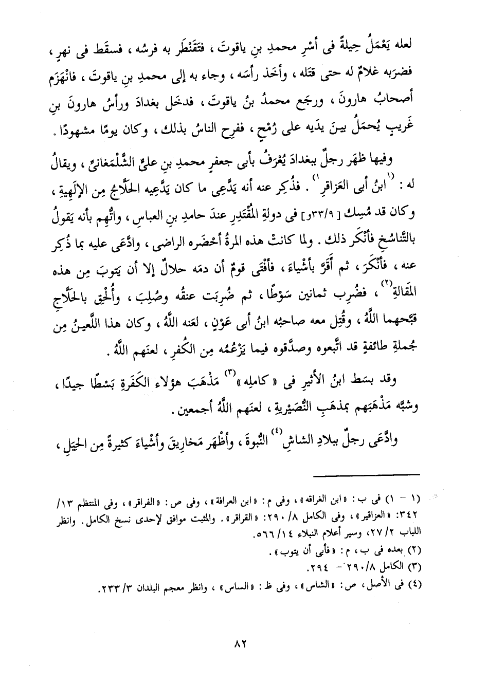 وَقَدْ بَسَطَ ابْنُ الْأَثِيرِ فِي " كَامِلِهِ " مَذْهَبَ هَؤُلَاءِ الْكَفَرَةِ بَسْطًا جَيِّدًا، وَشَبَّهَ مَذْهَبَهُمْ بِمَذْهَبِ النَّصِيرِيَّةِ، لَعَنَهُمَا اللَّهُ أَجْمَعِينَ.