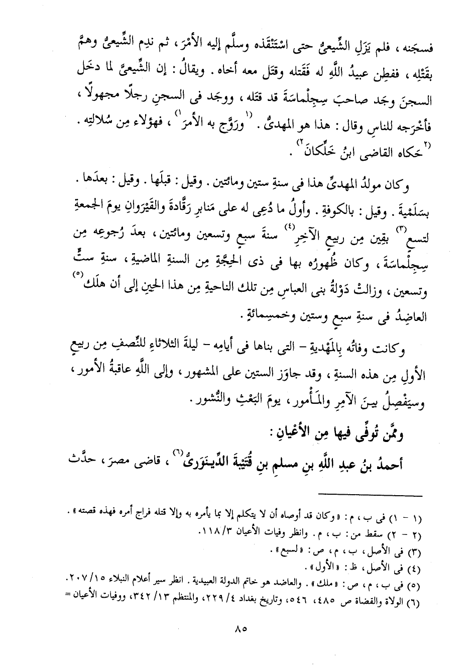 وَكَانَ مَوْلِدُ الْمُهْدِيِّ هَذَا فِي سَنَةِ سِتِّينَ وَمِائَتَيْنِ، وَقِيلَ: قَبْلَهَا، وَقِيلَ: بَعْدَهَا. بِسَلَمْيَةَ، وَقِيلَ: بِالْكُوفَةِ. وَأَوَّلُ مَا دُعِيَ لَهُ عَلَى مَنَابِرِ رَقَّادَةَ وَالْقَيْرَوَانِ يَوْمَ الْجُمُعَةِ لِتِسْعٍ بَقِينَ مِنْ رَبِيعٍ الْآخَرِ سَنَةَ سَبْعٍ وَتِسْعِينَ وَمِائَتَيْنِ، بَعْدَ رُجُوعِهِ مِنْ سِجِلْمَاسَةَ وَكَانَ ظُهُورُهُ بِهَا فِي ذِي الْحِجَّةِ مِنَ السَّنَةِ الْمَاضِيَةِ، سَنَةَ سِتٍّ وَتِسْعِينَ، وَزَالَتْ دَوْلَةُ بَنِي الْعَبَّاسِ مِنْ تِلْكَ النَّاحِيَةِ مِنْ هَذَا الْحِينِ إِلَى أَنْ هَلَكَ الْعَاضِدُ فِي سَنَةِ سَبْعٍ وَسِتِّينَ وَخَمْسِمِائَةٍ.