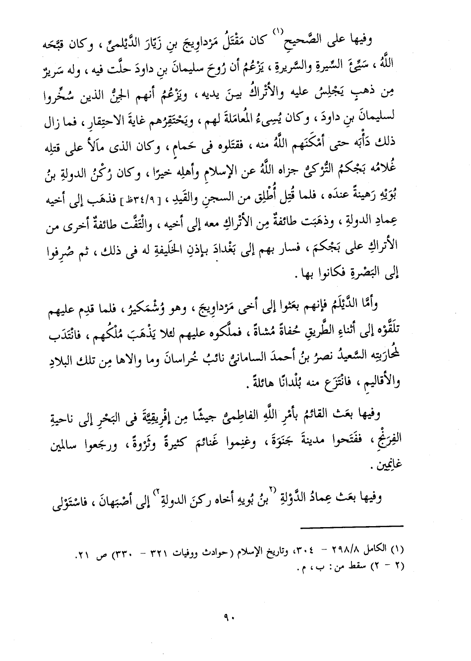 وَفِيهَا عَلَى الصَّحِيحِ كَانَ مَقْتَلُ مَرْدَاوِيجَ بْنِ زِيَّارَ الدَّيْلَمِيِّ، وَكَانَ قَبَّحَهُ اللَّهُ سَيِّئَ السِّيرَةِ وَالسَّرِيرَةِ، يَزْعُمُ أَنَّ رُوحَ سُلَيْمَانَ بْنِ دَاوُدَ حَلَّتْ فِيهِ، وَلَهُ سَرِيرٌ مِنْ ذَهَبٍ يَجْلِسُ عَلَيْهِ وَالْأَتْرَاكُ بَيْنَ يَدَيْهِ، وَيَزْعُمُ أَنَّهُمُ الْجِنُّ الَّذِينَ سُخِّرُوا لِسُلَيْمَانَ بْنِ دَاوُدَ، وَكَانَ يُسِيءُ الْمُعَامَلَةَ لَهُمْ، وَيَحْتَقِرُهُمْ غَايَةَ الِاحْتِقَارِ، فَمَا زَالَ ذَلِكَ دَأْبُهُ حَتَّى أَمْكَنَهُمُ اللَّهُ مِنْهُ، فَقَتَلُوهُ فِي حَمَّامٍ، وَكَانَ الَّذِي مَالَأَ عَلَى قَتْلِهِ غُلَامُهُ بَجْكَمُ التُّرْكِيُّ - جَزَاهُ اللَّهُ عَنِ الْإِسْلَامِ وَأَهْلِهِ خَيْرًا - وَكَانَ رُكْنُ الدَّوْلَةِ بْنُ بُوَيْهِ رَهِينَةً عِنْدَهُ، فَلَمَّا قُتِلَ أُطْلِقَ مِنَ السِّجْنِ وَالْقَيْدِ، فَذَهَبَ إِلَى أَخِيهِ عِمَادِ الدَّوْلَةِ، وَذَهَبَتْ طَائِفَةٌ مِنَ الْأَتْرَاكِ مَعَهُ إِلَى أَخِيهِ، وَالْتَفَّتْ طَائِفَةٌ أُخْرَى مَنَ الْأَتْرَاكِ عَلَى بَجْكَمَ، فَسَارَ بِهِمْ إِلَى بَغْدَادَ بِإِذْنِ الْخَلِيفَةِ لَهُ فِي ذَلِكَ، ثُمَّ صُرِفُوا إِلَى الْبَصْرَةِ فَكَانُوا بِهَا.