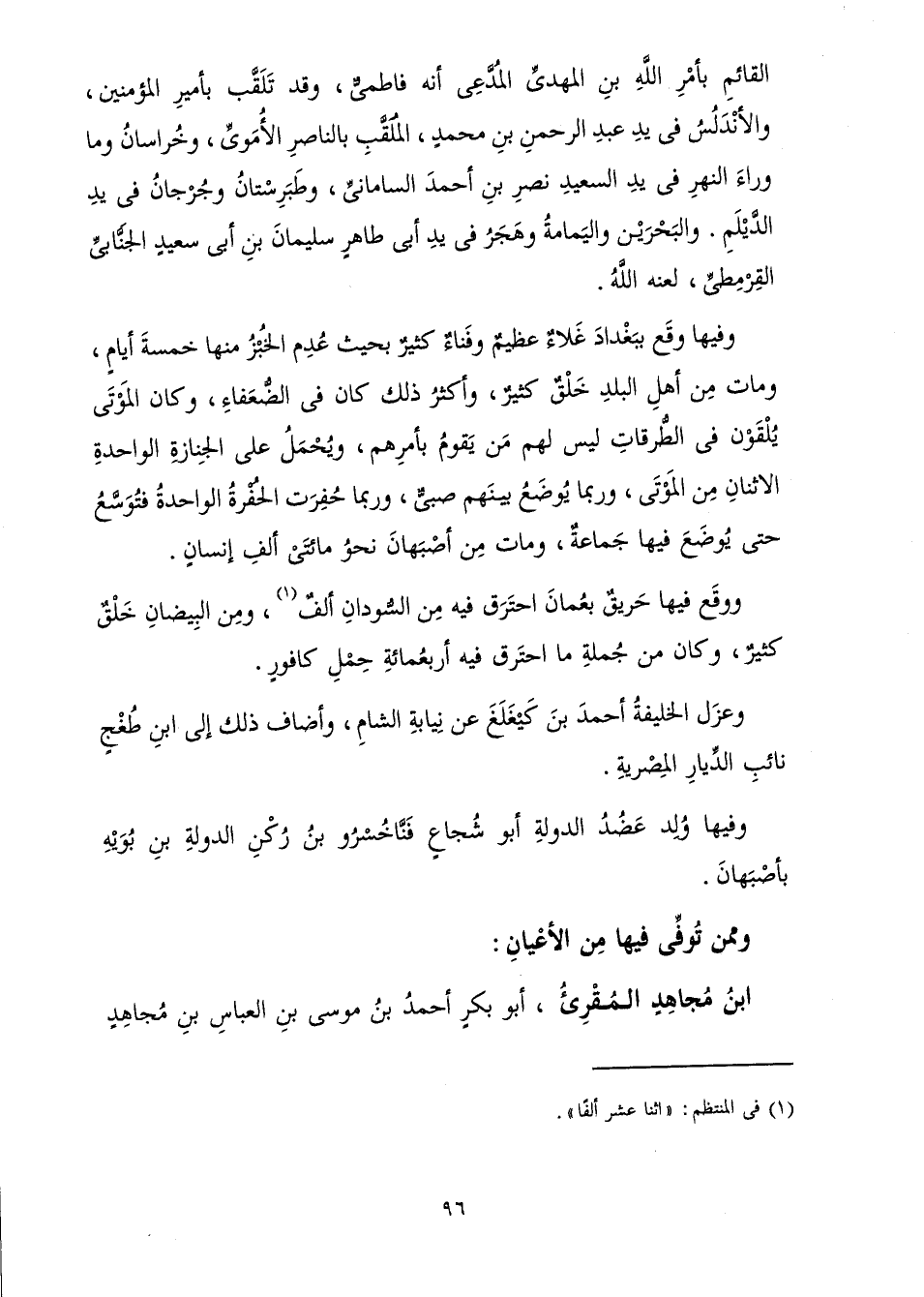 الْقَائِمِ بِأَمْرِ اللَّهِ بْنِ الْمَهْدِيِّ الْمُدَّعِي أَنَّهُ فَاطِمِيٌّ، وَقَدْ تَلَقَّبَ بِأَمِيرِ الْمُؤْمِنِينَ، وَالْأَنْدَلُسُ فِي يَدِ عَبْدِ الرَّحْمَنِ بْنِ مُحَمَّدٍ، الْمُلَقَّبِ بِالنَّاصِرِ الْأُمَوِيِّ، وَخُرَاسَانُ وَمَا وَرَاءَ النَّهْرِ فِي يَدِ السَّعِيدِ نَصْرِ بْنِ أَحْمَدَ السَّامَانِيِّ، وَطَبَرِسْتَانُ وَجُرْجَانُ فِي يَدِ الدَّيْلَمِ، وَالْبَحْرَيْنِ وَالْيَمَامَةُ وَهَجَرُ فِي يَدِ أَبِي طَاهِرٍ سُلَيْمَانِ بْنِ أَبِي سَعِيدٍ الْجَنَّابِيِّ الْقِرْمِطِيِّ، لَعَنَهُ اللَّهُ.