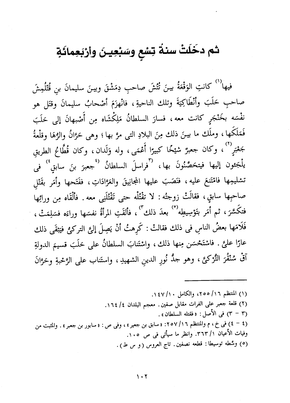 وَفِيهَا كَانَتِ الْوَقْعَةُ بَيْنَ تُتُشَ صَاحِبِ دِمَشْقَ وَبَيْنَ سُلَيْمَانَ بْنِ قُتْلُمِشَ صَاحِبِ حَلَبَ وَأَنْطَاكِيَةَ وَتِلْكَ النَّاحِيَةِ، فَانْهَزَمَ أَصْحَابُ سُلَيْمَانَ وَقَتَلَ هُوَ نَفْسَهُ بِخَنْجَرٍ كَانَتْ مَعَهُ فَسَارَ السُّلْطَانُ مَلِكْشَاهْ مِنْ أَصْبَهَانَ إِلَى حَلَبَ فَمَلَكَهَا، وَمَلَكَ مَا بَيْنَ ذَلِكَ مِنَ الْبِلَادِ الَّتِي مَرَّ بِهَا وَهِيَ حَرَّانُ وَالرُّهَا وَقَلْعَةُ جَعْبَرٍ، وَكَانَ جَعْبَرٌ شَيْخًا كَبِيرًا قَدْ عَمِيَ وَلَهُ وَلَدَانِ، وَكَانَ قُطَّاعُ الطَّرِيقِ يَلْجَئُونَ إِلَيْهَا فَيَتَحَصَّنُونَ بِهَا فَرَاسَلَ السُّلْطَانُ جَعْبَرَ بْنَ سَابِقٍ فِي تَسْلِيمِهَا فَامْتَنَعَ عَلَيْهِ، فَنَصَبَ عَلَيْهَا الْمَجَانِيقَ وَالْعَرَّادَاتِ فَفَتَحَهَا وَأَمَرَ بِقَتْلِ صَاحِبِهَا سَابِقٍ، فَقَالَتْ زَوْجَتُهُ لَا تَقْتُلْهُ حَتَّى تَقْتُلَنِي مَعَهُ فَأَلْقَاهُ مِنْ وَرَائِهَا فَتَكَسَّرَ، ثُمَّ أَمَرَ بِتَوْسِيطِهِ بَعْدَ ذَلِكَ فَأَلْقَتِ الْمَرْأَةُ نَفْسَهَا وَرَاءَهُ فَسَلِمَتْ، فَلَامَهَا بَعْضُ النَّاسِ فِي ذَلِكَ فَقَالَتْ: كَرِهْتُ أَنْ يَصِلَ إِلَيَّ التُّرْكِيُّ فَيَبْقَى ذَلِكَ عَارًا عَلَيَّ. فَاسْتَحْسَنَ مِنْهَا ذَلِكَ وَاسْتَنَابَ السُّلْطَانُ عَلَى حَلَبَ قَسِيمَ الدَّوْلَةِ آقْ سُنْقُرَ التُّرْكِيَّ وَهُوَ جَدُّ نُورِ الدِّينِ الشَّهِيدِ وَاسْتَنَابَ عَلَى الرَّحْبَةِ وَحَرَّانَ
