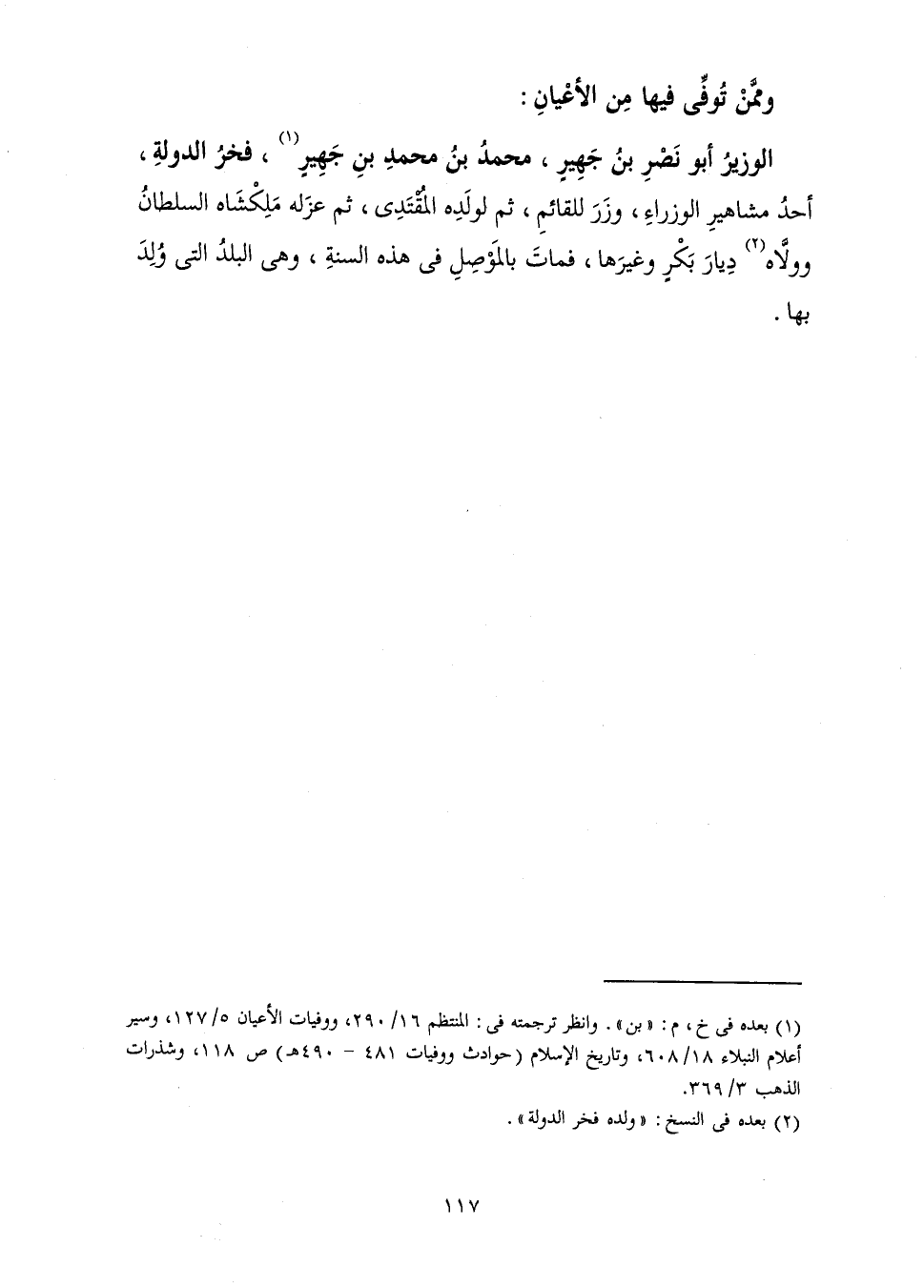 الْوَزِيرُ أَبُو نَصْرِ بْنُ جَهِيرٍ، مُحَمَّدُ بْنُ مُحَمَّدِ بْنِ جَهِيرٍ فَخْرُ الدَّوْلَةِ أَحَدُ مَشَاهِيرِ الْوُزَرَاءِ، وَزَرَ لِلْقَائِمِ ثُمَّ لِوَلَدِهِ الْمُقْتَدِي ثُمَّ عَزَلَهُ مَلِكْشَاهْ السُّلْطَانُ وَوَلَّاهُ دِيَارَ بَكْرٍ وَغَيْرَهَا، فَمَاتَ بِالْمَوْصِلِ وَهِيَ الْبَلَدُ الَّتِي وُلِدَ بِهَا.