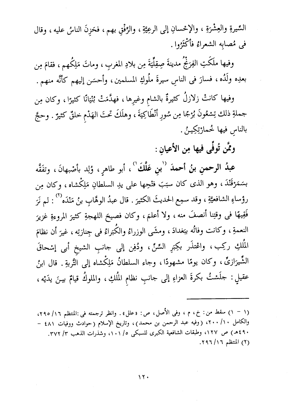 عَبْدُ الرَّحْمَنِ بْنُ أَحْمَدَ بْنِ عَلَّكَ، أَبُو طَاهِرٍ وُلِدَ بِأَصْبَهَانَ وَتَفَقَّهَ بِسَمَرْقَنْدَ وَهُوَ الَّذِي كَانَ سَبَبَ فَتْحِهَا عَلَى يَدِ السُّلْطَانِ مَلِكْشَاهْ وَكَانَ مِنْ رُؤَسَاءِ الشَّافِعِيَّةِ وَقَدْ سَمِعَ الْحَدِيثَ الْكَثِيرَ. قَالَ عَبْدُ الْوَهَّابِ بْنُ مَنْدَهْ: لَمْ نَرَ فَقِيهًا فِي وَقْتِنَا أَنْصَفَ مِنْهُ وَلَا أَعْلَمَ، وَكَانَ فَصِيحَ اللَّهْجَةِ، كَثِيرَ الْمُرُوءَةِ غَزِيرَ النِّعْمَةِ، تُوُفِّيَ بِبَغْدَادَ وَمَشَى الْوُزَرَاءُ وَالْكُبَرَاءُ فِي جِنَازَتِهِ غَيْرَ أَنَّ نِظَامَ الْمُلْكِ رَكِبَ وَاعْتَذَرَ بِكِبَرِ السِّنِّ وَدُفِنَ إِلَى جَانِبِ الشَّيْخِ أَبِي إِسْحَاقَ الشِّيرَازِيِّ، وَكَانَ يَوْمًا مَشْهُودًا، وَجَاءَ السُّلْطَانُ مَلِكْشَاهْ إِلَى التُّرْبَةِ، قَالَ ابْنُ عَقِيلٍ: جَلَسْتُ بُكْرَةَ الْعَزَاءِ إِلَى جَانِبِ نِظَامِ الْمُلْكِ وَالْمُلُوكُ قِيَامٌ بَيْنَ يَدَيْهِ