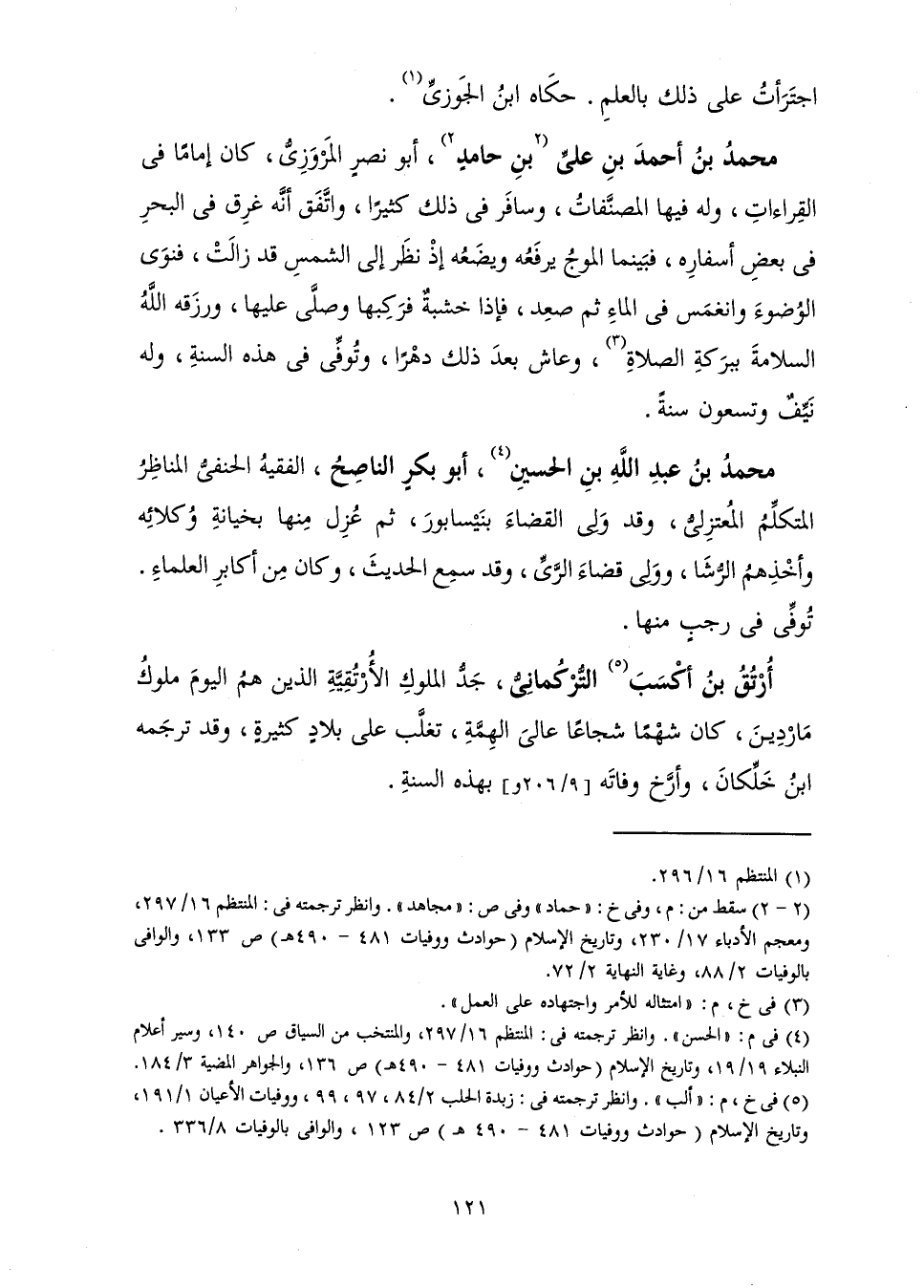 أَبُو نَصْرٍ الْمَرْوَزِيُّ، كَانَ إِمَامًا فِي الْقِرَاءَاتِ وَلَهُ فِيهَا الْمُصَنَّفَاتُ، وَسَافَرَ فِي ذَلِكَ كَثِيرًا، وَاتَّفَقَ لَهُ أَنَّهُ غَرِقَ فِي الْبَحْرِ فِي بَعْضِ أَسْفَارِهِ ; فَبَيْنَمَا الْمَوْجُ يَرْفَعُهُ وَيَضَعُهُ إِذْ نَظَرَ إِلَى الشَّمْسِ قَدْ زَالَتْ فَنَوَى الْوُضُوءَ وَانْغَمَسَ فِي الْمَاءِ، ثُمَّ صَعِدَ فَإِذَا خَشَبَةٌ فَرَكِبَهَا وَصَلَّى عَلَيْهَا وَرَزَقَهُ اللَّهُ السَّلَامَةَ بِبَرَكَةِ الصَّلَاةِ وَعَاشَ بَعْدَ ذَلِكَ دَهْرًا وَتُوُفِّيَ فِي هَذِهِ السَّنَةِ وَلَهُ نَيِّفٌ وَتِسْعُونَ سَنَةً.