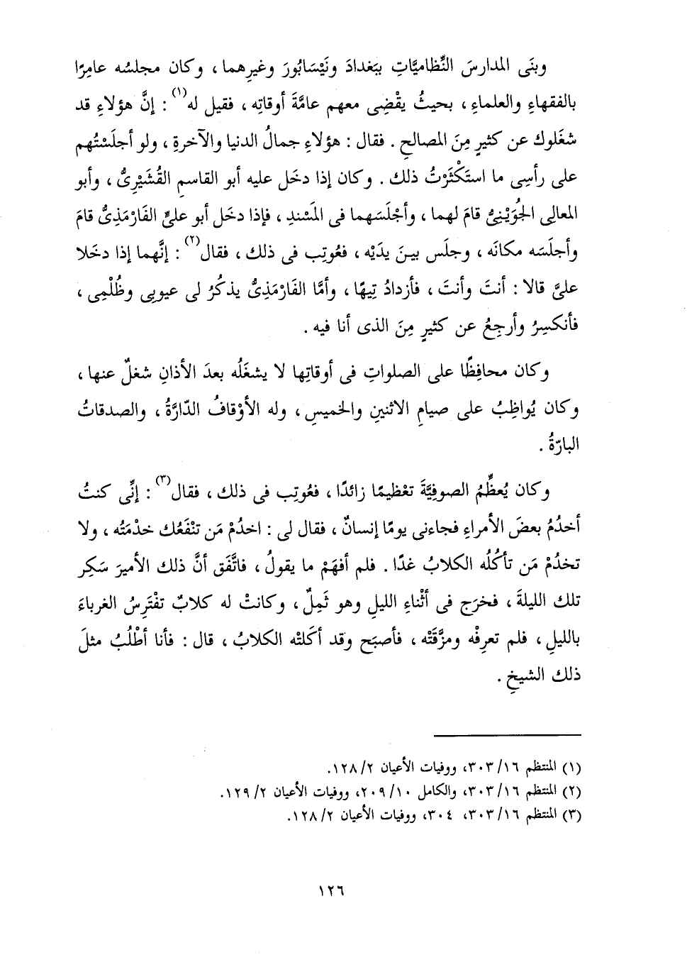 وَبَنَى الْمَدَارِسَ النِّظَامِيَّاتِ بِبَغْدَادَ وَنَيْسَابُورَ وَغَيْرِهِمَا، وَكَانَ مَجْلِسُهُ عَامِرًا بِالْفُقَهَاءِ وَالْعُلَمَاءِ بِحَيْثُ يَقْضِي مَعَهُمْ عَامَّةَ أَوْقَاتِهِ، فَقِيلَ لَهُ: إِنَّ هَؤُلَاءِ شَغَلُوكَ عَنْ كَثِيرٍ مِنَ الْمَصَالِحِ، فَقَالَ: هَؤُلَاءِ جَمَالُ الدُّنْيَا وَالْآخِرَةِ، وَلَوْ أَجْلَسْتُهُمْ عَلَى رَأْسِي مَا اسْتَكْثَرْتُ ذَلِكَ، وَكَانَ إِذَا دَخَلَ عَلَيْهِ أَبُو الْقَاسِمِ الْقُشَيْرِيُّ وَأَبُو الْمَعَالِي الْجُوَيْنِيُّ قَامَ لَهُمَا وَأَجْلَسَهُمَا فِي الْمَسْنَدِ، فَإِذَا دَخَلَ أَبُو عَلِيٍّ الْفَارْمَذِيُّ قَامَ وَأَجْلَسَهُ مَكَانَهُ وَجَلَسَ بَيْنَ يَدَيْهِ، فَعُوتِبَ فِي ذَلِكَ، فَقَالَ: إِنَّهُمَا إِذَا دَخَلَا عَلَيَّ قَالَا: أَنْتَ وَأَنْتَ فَأَزْدَادُ تِيهًا، وَأَمَّا الْفَارْمَذِيُّ يَذْكُرُ لِي عُيُوبِي وَظُلْمِي، فَأَنْكَسِرُ وَأَرْجِعُ عَنْ كَثِيرٍ مِنَ الَّذِي أَنَا فِيهِ.
