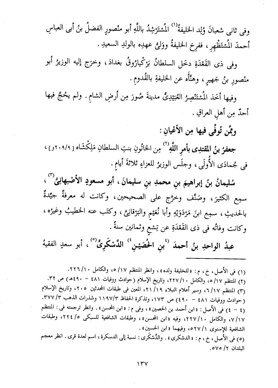 جَعْفَرُ بْنُ الْمُقْتَدِي بِأَمْرِ اللَّهِ مِنَ الْخَاتُونِ بِنْتِ السُّلْطَانِ مَلِكْشَاهْ فِي جُمَادَى الْأُولَى، وَجَلَسَ الْوَزِيرُ لِلْعَزَاءِ ثَلَاثَةَ أَيَّامٍ.