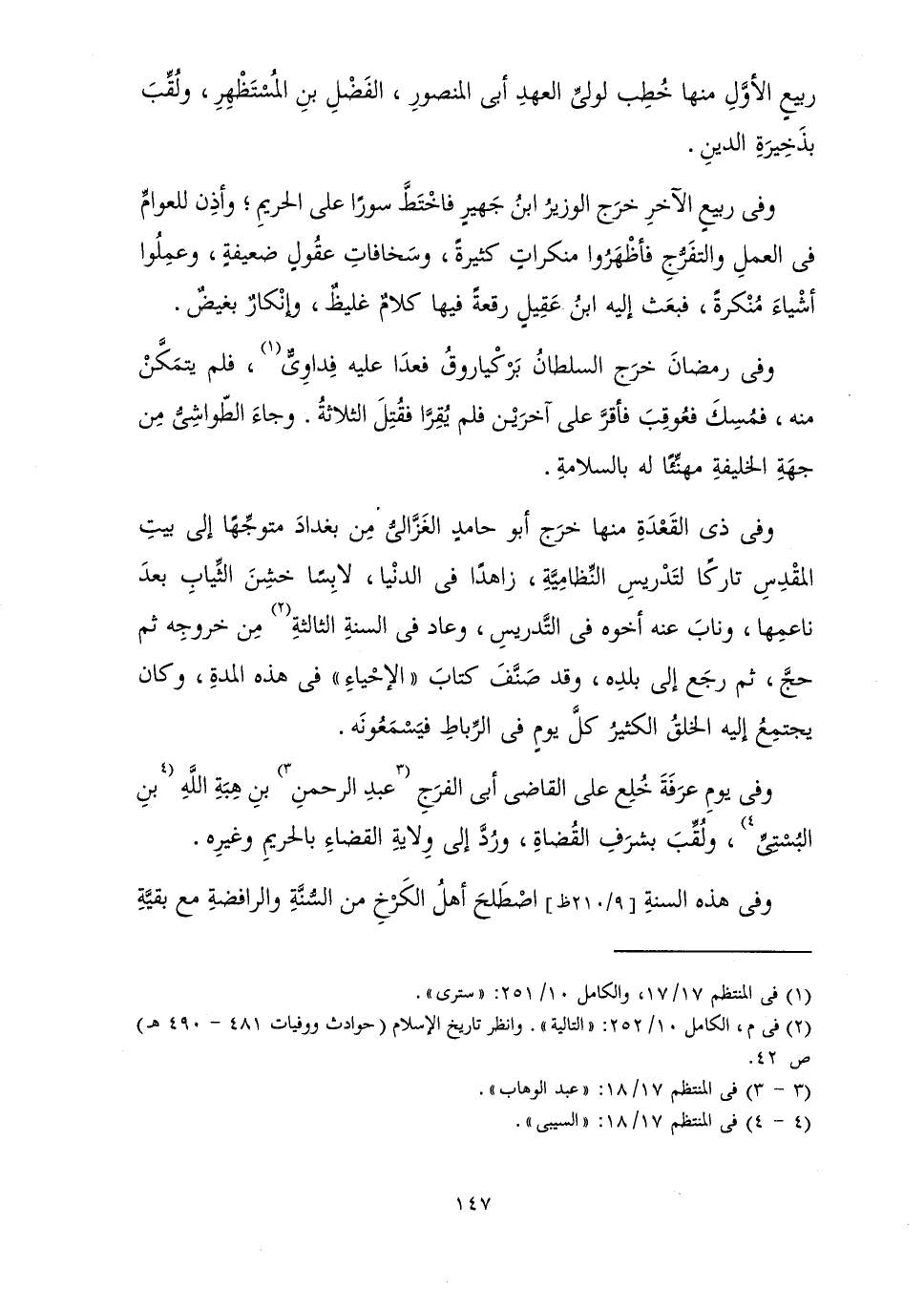 وَفِي ذِي الْقَعْدَةِ مِنْهَا خَرَجَ أَبُو حَامِدٍ الْغَزَّالِيُّ مِنْ بَغْدَادَ مُتَوَجِّهًا إِلَى بَيْتِ الْمَقْدِسِ تَارِكًا لِتَدْرِيسِ النِّظَامِيَّةِ، زَاهِدًا فِي الدُّنْيَا لَابِسًا خَشِنَ الثِّيَابِ بَعْدَ نَاعِمِهَا، وَنَابَ عَنْهُ أَخُوهُ فِي التَّدْرِيسِ، وَعَادَ فِي السَّنَةِ الثَّالِثَةِ مِنْ خُرُوجِهِ ثُمَّ حَجَّ ثُمَّ رَجَعَ إِلَى بَلَدِهِ، وَقَدْ صَنَّفَ كِتَابَ الْإِحْيَاءِ فِي هَذِهِ الْمُدَّةِ وَكَانَ يَجْتَمِعُ إِلَيْهِ الْخَلْقُ الْكَثِيرُ كُلَّ يَوْمٍ فِي الرِّبَاطِ فَيَسْمَعُونَهُ.