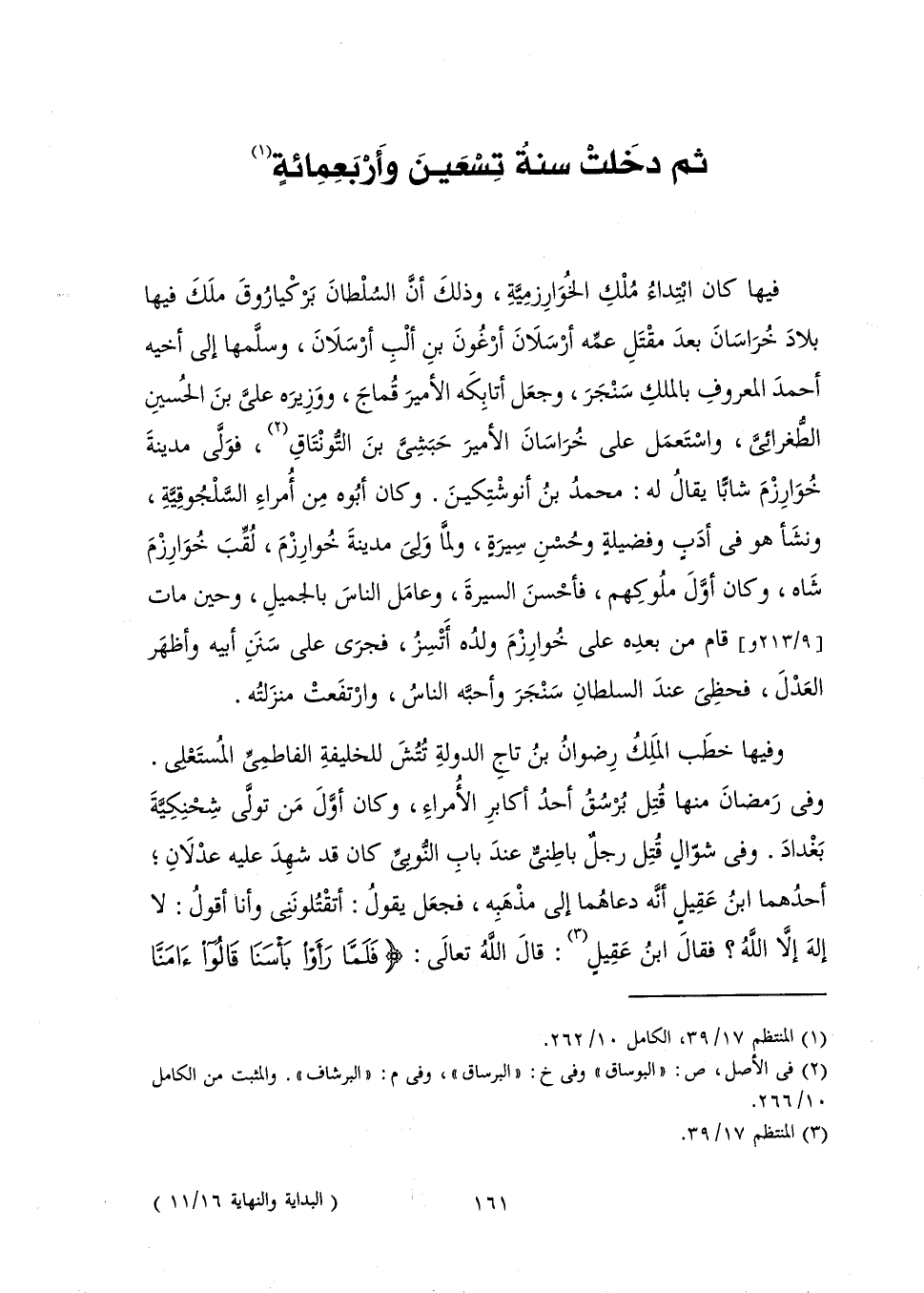 فِيهَا كَانَ ابْتِدَاءُ مُلْكِ الْخُوَارَزْمِيَّةِ، وَذَلِكَ أَنَّ السُّلْطَانَ بَرْكْيَارُوقَ مَلَكَ فِيهَا بِلَادَ خُرَاسَانَ بَعْدَ مَقْتَلِ عَمِّهِ أَرْسَلَانَ أَرْغُونَ بْنِ أَلْبِ أَرْسَلَانَ وَسَلَّمَهَا إِلَى أَخِيهِ أَحْمَدَ الْمَعْرُوفِ بِالْمَلِكِ سَنْجَرَ، وَجَعَلَ أَتَابِكَهُ الْأَمِيرَ قُمَاجَ وَوَزِيرَهُ عَلِيَّ بْنَ الْحُسَيْنِ الطُّغْرَائِيَّ، وَاسْتَعْمَلَ عَلَى خُرَاسَانَ الْأَمِيرَ حَبَشِيَّ بْنَ التُّونْتَاقِ، فَوَلَّى مَدِينَةَ خُوَارِزْمَ شَابًّا يُقَالُ لَهُ: مُحَمَّدُ بْنُ أَنُوشْتِكِينَ، وَكَانَ أَبُوهُ مِنْ أُمَرَاءِ السَّلْجُوقِيَّةِ، وَنَشَأَ هُوَ فِي أَدَبٍ وَفَضِيلَةٍ وَحُسْنِ سِيرَةٍ، وَلَمَّا وَلِيَ مَدِينَةَ خُوَارِزْمَ لُقِّبَ خُوَارِزْمَ شَاهْ، وَكَانَ أَوَّلَ مُلُوكِهِمْ فَأَحْسَنَ السِّيرَةَ، وَعَامَلَ النَّاسَ بِالْجَمِيلِ، وَحِينَ مَاتَ قَامَ مِنْ بَعْدِهِ عَلَى خُوَارِزْمَ وَلَدُهُ أَتْسِزُ، فَجَرَى عَلَى سُنَنِ أَبِيهِ وَأَظْهَرَ الْعَدْلَ، فَحَظِيَ عِنْدَ السُّلْطَانِ سَنْجَرَ، وَأَحَبَّهُ النَّاسُ، وَارْتَفَعَتْ مَنْزِلَتُهُ.