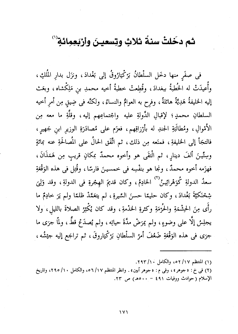فِي صَفَرٍ مِنْهَا دَخَلَ السُّلْطَانُ بَرْكْيَارُوقُ إِلَى بَغْدَادَ وَنَزَلَ بِدَارِ الْمُلْكِ، وَأُعِيدَتْ لَهُ الْخُطْبَةُ بِبَغْدَادَ، وَقُطِعَتْ خُطْبَةُ أَخِيهِ مُحَمَّدُ بْنُ مَلِكْشَاهْ، وَبَعَثَ إِلَيْهِ الْخَلِيفَةُ هَدِيَّةً هَائِلَةً، وَفَرِحَ بِهِ الْعَوَامُّ وَالنِّسَاءُ ; وَلَكِنَّهُ فِي ضِيقٍ مِنْ أَمْرِ أَخِيهِ السُّلْطَانِ مُحَمَّدٍ ; لِإِقْبَالِ الدَّوْلَةِ عَلَيْهِ وَاجْتِمَاعِهِمْ إِلَيْهِ، وَقِلَّةِ مَا مَعَهُ مِنْ أَمْوَالٍ، وَمُطَالَبَةِ الْجُنْدِ لَهُ بِأَرْزَاقِهِمْ، فَعَزَمَ عَلَى مُصَادَرَةِ الْوَزِيرِ ابْنِ جَهِيرٍ فَالْتَجَأَ إِلَى الْخَلِيفَةِ فَمَنَعَهُ مِنْ ذَلِكَ، ثُمَّ اتَّفَقَ الْحَالُ عَلَى الْمُصَالَحَةِ عَنْهُ بِمِائَةٍ وَسِتِّينَ أَلْفَ دِينَارٍ، ثُمَّ الْتَقَى هُوَ وَأَخُوهُ مُحَمَّدٌ بِمَكَانٍ قَرِيبٍ مِنْ هَمَذَانَ فَهَزَمَهُ أَخُوهُ مُحَمَّدٌ، وَنَجَا هُوَ بِنَفْسِهِ فِي خَمْسِينَ فَارِسًا، وَقُتِلَ فِي هَذِهِ الْوَقْعَةِ سَعْدُ الدَّوْلَةِ كُوَهْرَائِينُ الْخَادِمُ وَكَانَ قَدِيمَ الْهِجْرَةِ فِي الدَّوْلَةِ وَقَدْ وَلِيَ شِحْنَكِيَّةَ بَغْدَادَ، وَكَانَ حَلِيمًا حَسَنَ السِّيرَةِ لَمْ يَتَعَمَّدْ ظُلْمًا، وَلَمْ يَرَ خَادِمٌ مَا رَأَى مِنَ الْحِشْمَةِ وَالْحُرْمَةِ وَكَثْرَةِ الْخِدْمَةِ، وَقَدْ كَانَ يُكْثِرُ الصَّلَاةَ بِاللَّيْلِ وَلَا يَجْلِسُ إِلَّا عَلَى وُضُوءٍ، وَلَمْ يَمْرَضْ مُدَّةَ حَيَاتِهِ، وَلَمْ يُصْدَعْ قَطُّ، وَلَمَّا جَرَى مَا جَرَى فِي هَذِهِ الْوَقْعَةِ ضَعُفَ أَمْرُ السُّلْطَانِ بَرْكْيَارُوقَ، ثُمَّ تَرَاجَعَ إِلَيْهِ جَيْشُهُ،