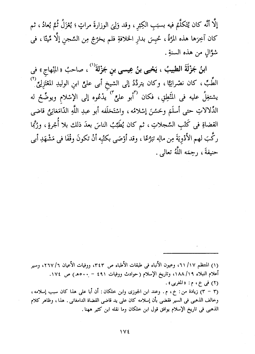 يَحْيَى بْنُ عِيسَى بْنِ جَزْلَةَ، صَاحِبُ " الْمِنْهَاجِ " فِي الطِّبِّ، كَانَ نَصْرَانِيًّا وَكَانَ يَتَرَدَّدُ إِلَى الشَّيْخِ أَبِي عَلِيِّ بْنِ الْوَلِيدِ الْمُعْتَزِلِيِّ يَشْتَغِلُ عَلَيْهِ فِي الْمَنْطِقِ، فَكَانَ أَبُو عَلِيٍّ يَدْعُوهُ إِلَى الْإِسْلَامِ وَيُوَضِّحُ لَهُ الدَّلَالَاتِ حَتَّى أَسْلَمَ وَحَسُنَ إِسْلَامُهُ، وَاسْتَخْلَفَهُ أَبُو عَبْدِ اللَّهِ الدَّامَغَانِيُّ قَاضِي الْقُضَاةِ فِي كَتْبِ السِّجِلَّاتِ، ثُمَّ كَانَ يُطَبِّبُ النَّاسَ بَعْدَ ذَلِكَ بِلَا أُجْرَةٍ، وَرُبَّمَا رَكَّبَ لَهُمُ الْأَدْوِيَةَ مِنْ مَالِهِ تَبَرُّعًا، وَقَدْ أَوْصَى بِكُتُبِهِ أَنْ تَكُونَ وَقْفًا بِمَشْهَدِ أَبِي حَنِيفَةَ؛ رَحِمَهُ اللَّهُ تَعَالَى.