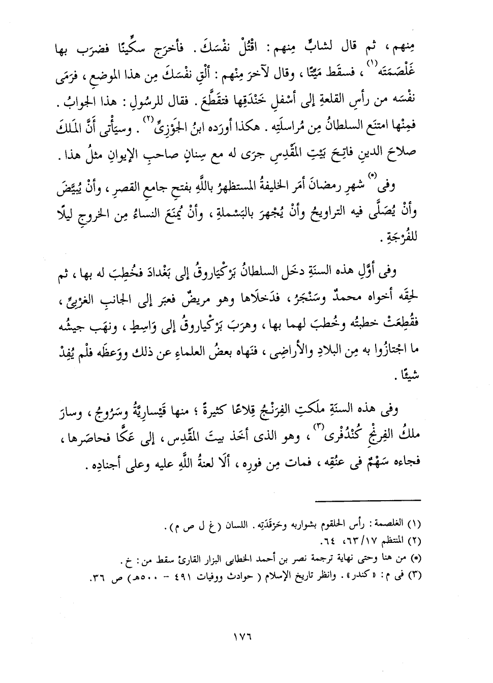 مِنْهُمْ، ثُمَّ قَالَ لِشَابٍ مِنْهُمْ: اقْتُلْ نَفْسَكَ، فَأَخْرَجَ سِكِّينًا فَضَرَبَ بِهَا غَلْصَمَتَهُ، فَسَقَطَ مَيِّتًا، وَقَالَ لِآخَرَ مِنْهُمْ: أَلْقِ نَفْسَكَ مِنْ هَذَا الْمَوْضِعِ فَرَمَى نَفْسَهُ مِنْ رَأْسِ الْقَلْعَةِ إِلَى أَسْفَلِ خَنْدَقِهَا فَتَقَطَّعَ، فَقَالَ لِلرَّسُولِ: هَذَا الْجَوَابُ فَمِنْهَا امْتَنَعَ السُّلْطَانُ مِنْ مُرَاسَلَتِهِ، هَكَذَا ذَكَرَهُ ابْنُ الْجَوْزِيِّ وَسَيَأْتِي أَنَّ الْمَلِكَ صَلَاحَ الدِّينِ فَاتِحَ بَيْتِ الْمَقْدِسِ، جَرَى لَهُ مَعَ سِنَانٍ صَاحِبِ الْإِيوَانِ مِثْلُ هَذَا.