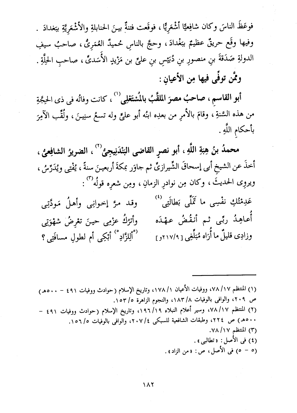 أَبُو نَصْرٍ الْقَاضِي الْبَنْدَنِيجِيُّ الضَّرِيرُ الشَّافِعِيُّ، أَخَذَ عَنِ الشَّيْخِ أَبِي إِسْحَاقَ الشِّيرَازِيِّ ثُمَّ جَاوَرَ بِمَكَّةَ أَرْبَعِينَ سَنَةً، يُفْتِي وَيُدَرِّسُ، وَيَرْوِي الْحَدِيثَ، وَكَانَ مِنْ نَوَادِرِ الزَّمَانِ، وَمِنْ شِعْرِهِ قَوْلُهُ: