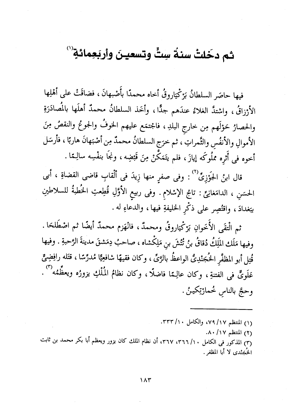 قَالَ ابْنُ الْجَوْزِيِّ: وَفِي صَفَرٍ مِنْهَا زِيدَ فِي أَلْقَابِ قَاضِي الْقُضَاةِ أَبِي الْحَسَنِ الدَّامَغَانِيِّ: تَاجُ الْإِسْلَامِ. وَفِي رَبِيعٍ الْأَوَّلِ قُطِعَتِ الْخُطْبَةُ لِلسَّلَاطِينِ بِبَغْدَادَ وَاقْتُصَرَ عَلَى ذِكْرِ الْخَلِيفَةِ فِيهَا وَالدُّعَاءِ لَهُ.