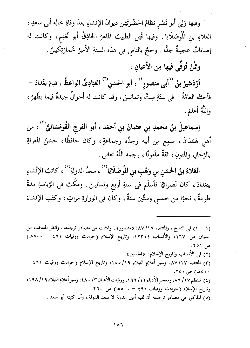 وَفِيهَا وَلِيَ أَبُو نَصْرٍ نِظَامُ الْحَضْرَتَيْنِ دِيوَانَ الْإِنْشَاءِ بَعْدَ وَفَاةِ خَالِهِ أَبِي سَعْدٍ الْعَلَاءِ بْنِ الْمُوصَلَايَا. وَفِيهَا قُتِلُ الطَّبِيبُ الْمَاهِرُ الْحَاذِقُ أَبُو نُعَيْمٍ، وَكَانَتْ لَهُ إِصَابَاتٌ عَجِيبَةٌ جِدًّا. وَحَجَّ بِالنَّاسِ فِي هَذِهِ السَّنَةِ الْأَمِيرُ خُمَارْتِكِينُ.