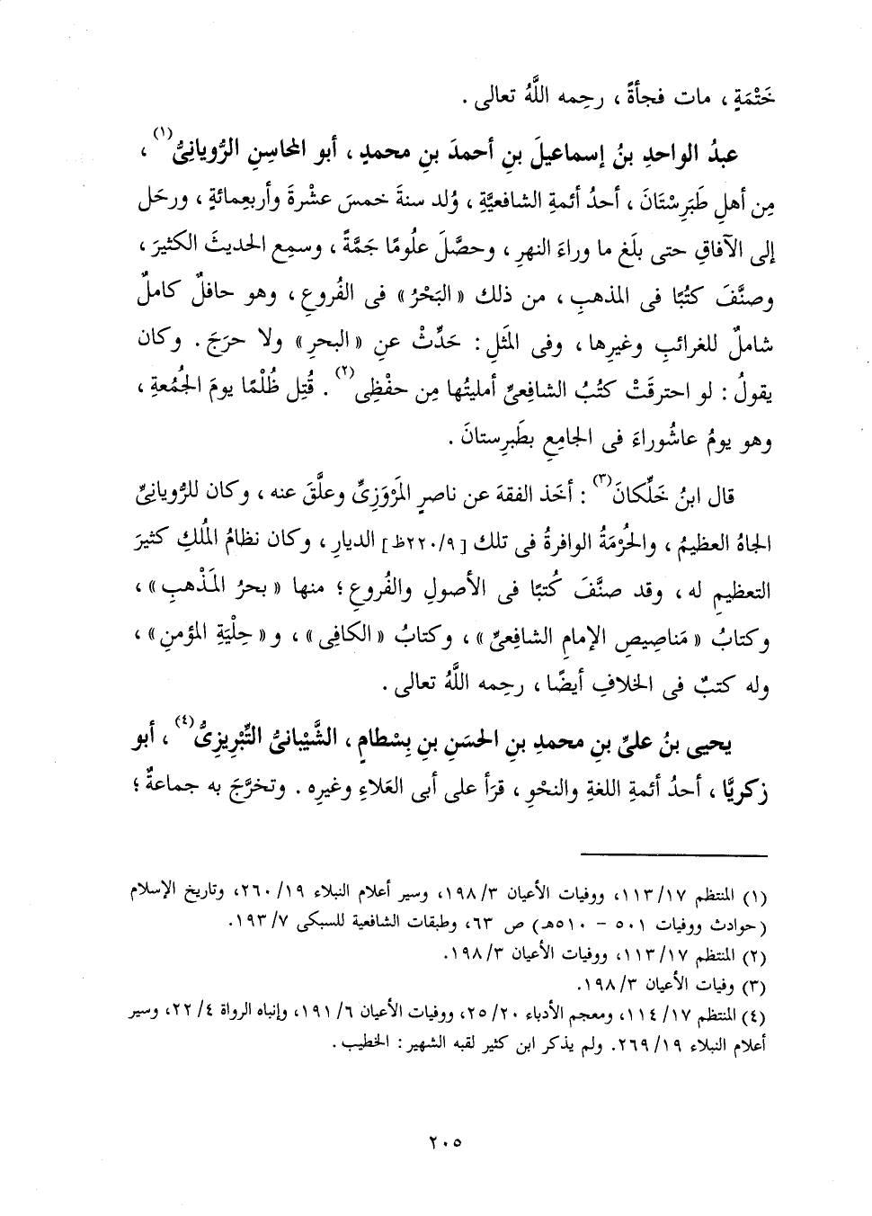أَبُو الْمَحَاسِنِ الرُّويَانِيُّ، مِنْ أَهْلِ طَبَرِسْتَانَ، أَحَدُ أَئِمَّةِ الشَّافِعِيَّةِ وُلِدَ سَنَةَ خَمْسَ عَشْرَةَ وَأَرْبَعِمِائَةٍ، وَرَحَلَ إِلَى الْآفَاقِ حَتَّى بَلَغَ مَا وَرَاءَ النَّهْرِ، وَحَصَّلَ عُلُومًا جَمَّةً، وَسَمِعَ الْحَدِيثَ الْكَثِيرَ، وَصَنَّفَ كُتُبًا فِي الْمَذْهَبِ مِنْ ذَلِكَ " الْبَحْرُ " فِي الْفُرُوعِ، وَهُوَ حَافِلٌ كَامِلٌ شَامِلٌ لِلْغَرَائِبِ وَغَيْرِهَا، وَفِي الْمَثَلِ: حَدِّثْ عَنِ الْبَحْرِ وَلَا حَرَجَ. وَكَانَ يَقُولُ: لَوِ احْتَرَقَتْ كُتُبُ الشَّافِعِيِّ أَمْلَيْتُهَا مِنْ حِفْظِي. قُتِلَ ظُلْمًا يَوْمَ الْجُمُعَةِ؛ وَهُوَ يَوْمُ عَاشُورَاءَ فِي الْجَامِعِ بِطَبَرِسْتَانَ.