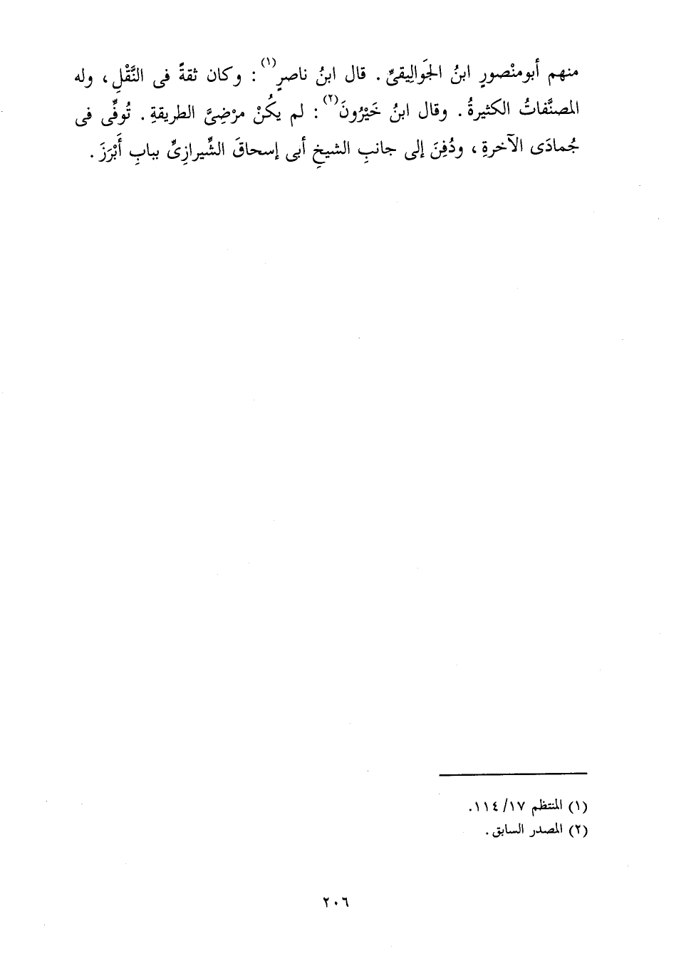 مِنْهُمْ أَبُو مَنْصُورٍ ابْنُ الْجَوَالِيقِيِّ، قَالَ ابْنُ نَاصِرٍ: وَكَانَ ثِقَةً فِي النَّقْلِ، وَلَهُ الْمُصَنَّفَاتُ الْكَثِيرَةُ. وَقَالَ ابْنُ خَيْرُونَ: لَمْ يَكُنْ مَرْضِيَّ الطَّرِيقَةِ، تُوُفِّيَ فِي جُمَادَى الْآخِرَةِ وَدُفِنَ إِلَى جَانِبِ الشَّيْخِ أَبِي إِسْحَاقَ الشِّيرَازِيِّ بِبَابِ أَبْرَزَ.