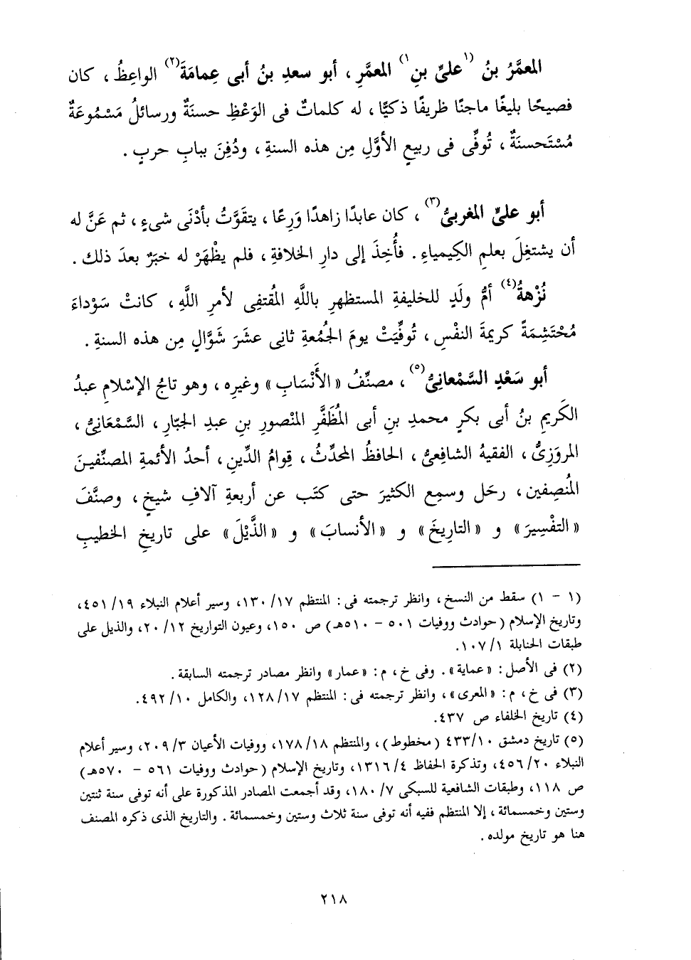 مُصَنِّفُ " الْأَنْسَابِ " وَغَيْرُهُ، وَهُوَ تَاجُ الْإِسْلَامِ عَبْدُ الْكَرِيمِ بْنُ أَبِي بَكْرِ بْنِ مُحَمَّدِ بْنِ أَبِي الْمُظَفَّرِ الْمَنْصُورِ بْنِ عَبْدِ الْجَبَّارِ، السَّمْعَانِيُّ، الْمَرْوَزِيُّ الْفَقِيهُ الشَّافِعِيُّ الْحَافِظُ الْمُحَدِّثُ، قِوَامُ الدِّينِ أَحَدُ الْأَئِمَّةِ الْمُصَنِّفِينَ رَحَلَ وَسَمِعَ الْكَثِيرَ حَتَّى كَتَبَ عَنْ أَرْبَعَةِ آلَافِ شَيْخٍ، وَصَنَّفَ " التَّفْسِيرَ "، " وَالتَّارِيخَ " وَ " الْأَنْسَابَ " وَ " الذَّيْلَ " عَلَى تَارِيخِ الْخَطِيبِ