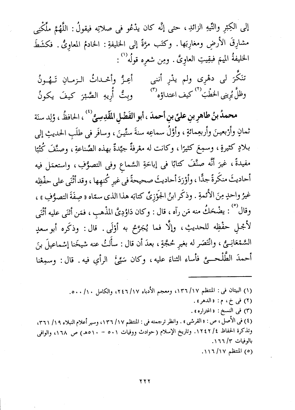 أَبُو الْفَضْلِ الْمَقْدِسِيُّ الْحَافِظُ، وُلِدَ سَنَةَ ثَمَانٍ وَأَرْبَعِينَ وَأَرْبَعِمَائَةٍ، وَأَوَّلُ سَمَاعِهِ سَنَةَ سِتِّينَ، وَسَافَرَ فِي طَلَبِ الْحَدِيثِ إِلَى بِلَادٍ كَثِيرَةٍ، وَسَمِعَ كَثِيرًا، وَكَانَتْ لَهُ مَعْرِفَةٌ جَيِّدَةٌ بِهَذِهِ الصِّنَاعَةِ، وَصَنَّفَ كُتُبًا مُفِيدَةً ; غَيْرَ أَنَّهُ صَنَّفَ كِتَابًا فِي إِبَاحَةِ السَّمَاعِ وَفِي التَّصَوُّفِ، وَاسْتَعْمَلَ فِيهِ أَحَادِيثَ مُنْكَرَةً جِدًّا، وَأَوْرَدَ أَحَادِيثَ صَحِيحَةً فِي غَيْرِ كُنْهِهَا، وَقَدْ أَثْنَى عَلَى حِفْظِهِ غَيْرُ وَاحِدٍ مِنَ الْأَئِمَّةِ.