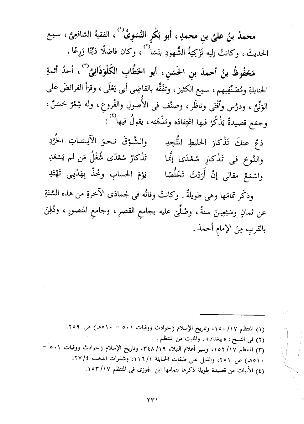 أَبُو الْخَطَّابِ الْكَلْوَذَانِيُّ، أَحَدُ أَئِمَّةِ الْحَنَابِلَةِ وَمُصَنِّفِيهِمْ، سَمِعَ الْكَثِيرَ، وَتَفَقَّهَ بِالْقَاضِي أَبِي يَعْلَى، وَقَرَأَ الْفَرَائِضَ عَلَى الْوَنِّيِّ، وَدَرَّسَ وَأَفْتَى وَنَاظَرَ، وَصَنَّفَ فِي الْأُصُولِ وَالْفُرُوعِ، وَلَهُ شِعْرٌ حَسَنٌ وَجَمَعَ قَصِيدَةً يَذْكُرُ فِيهَا اعْتِقَادَهُ وَمَذْهَبَهُ، يَقُولُ فِيهَا: