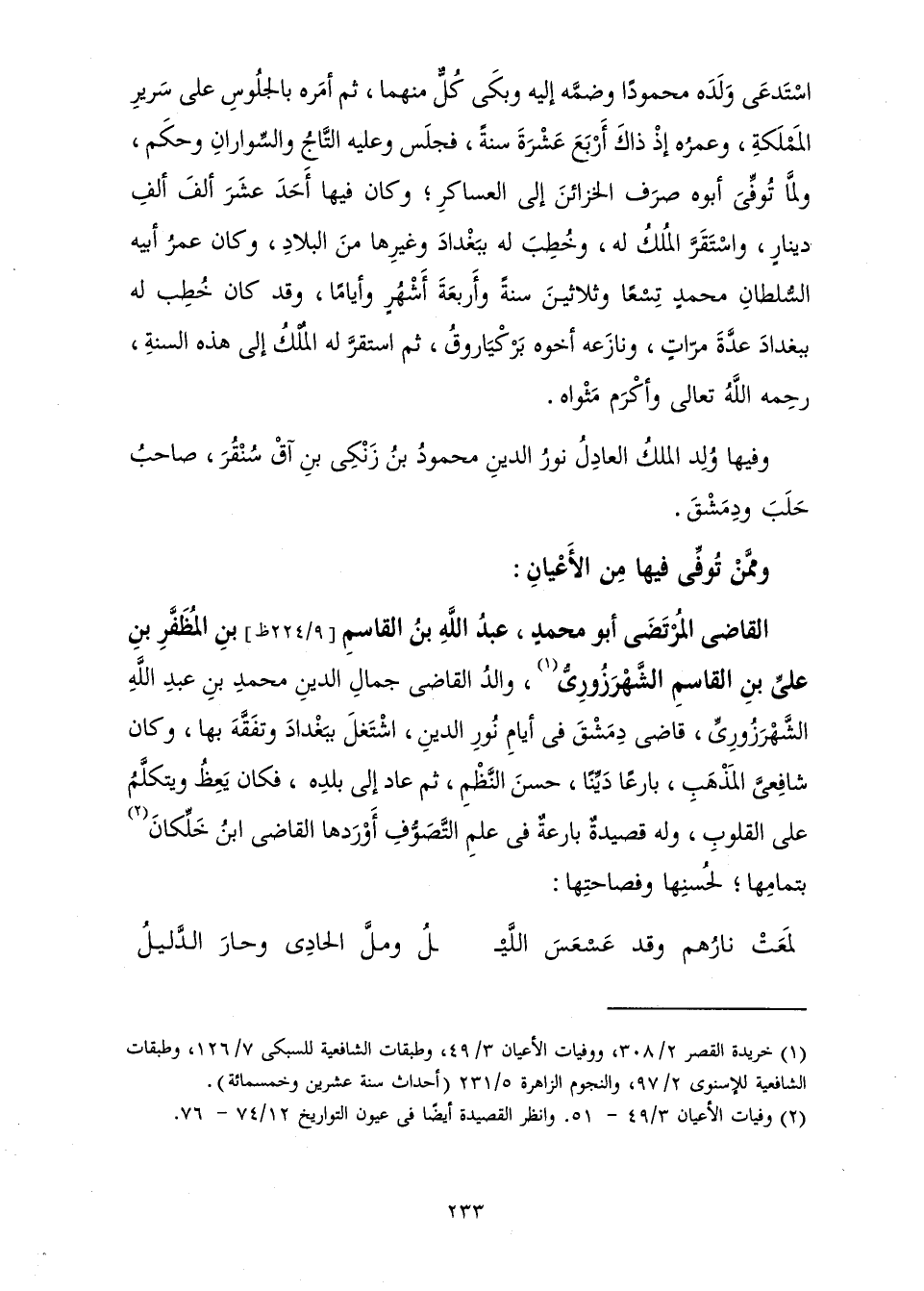 الْقَاضِي الْمُرْتَضَى أَبُو مُحَمَّدٍ عَبْدُ اللَّهِ بْنُ الْقَاسِمِ بْنِ الْمُظَفَّرِ بْنِ عَلِيِّ بْنِ الْقَاسِمِ الشَّهْرَزُورِيُّ، وَالِدُ الْقَاضِي جَمَالِ الدِّينِ مُحَمَّدِ بْنِ عَبْدِ اللَّهِ الشَّهْرَزُورِيِّ قَاضِي دِمَشْقَ فِي أَيَّامِ نُورِ الدِّينِ، اشْتَغَلَ بِبَغْدَادَ وَتَفَقَّهَ بِهَا، وَكَانَ شَافِعِيَّ الْمَذْهَبِ، بَارِعًا دَيِّنًا حَسَنَ النَّظْمِ، ثُمَّ عَادَ إِلَى بَلَدِهِ فَكَانَ يَعِظُ وَيَتَكَلَّمُ عَلَى الْقُلُوبِ، وَلَهُ قَصِيدَةٌ بَارِعَةٌ فِي عِلْمِ التَّصَوُّفِ، أَوْرَدَهَا الْقَاضِي ابْنُ خَلِّكَانَ بِتَمَامِهَا لِحُسْنِهَا وَفَصَاحَتِهَا: