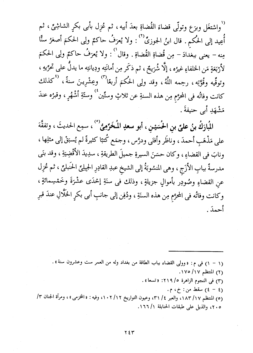 أَبُو سَعْدٍ الْمُخَرِّمِيُّ سَمِعَ الْحَدِيثَ، وَتَفَقَّهَ عَلَى مَذْهَبِ أَحْمَدَ وَنَاظَرَ وَأَفْتَى وَدَرَّسَ، وَجَمَعَ كُتُبًا كَثِيرَةً لَمْ يُسْبَقْ إِلَى مِثْلِهَا، وَنَابَ فِي الْقَضَاءِ، وَكَانَ حَسَنَ السِّيرَةِ، جَمِيلَ الطَّرِيقَةِ، سَدِيدَ الْأَقْضِيَةِ، وَقَدْ بَنَى مَدْرَسَةً بِبَابِ الْأَزَجِ، وَهِيَ الْمَنْسُوبَةُ إِلَى الشَّيْخِ عَبْدِ الْقَادِرِ الْجِيلِيِّ الْحَنْبَلِيِّ، ثُمَّ عُزِلَ عَنِ الْقَضَاءِ وَصُودِرَ بِأَمْوَالٍ جَزِيلَةٍ، وَذَلِكَ فِي سَنَةِ إِحْدَى عَشْرَةَ وَخَمْسِمِائَةٍ، وَكَانَتْ وَفَاتُهُ فِي الْمُحَرَّمِ مِنْ هَذِهِ السَّنَةِ، وَدُفِنَ إِلَى جَانِبِ أَبِي بَكْرٍ الْخَلَّالِ عِنْدَ قَبْرِ أَحْمَدَ.