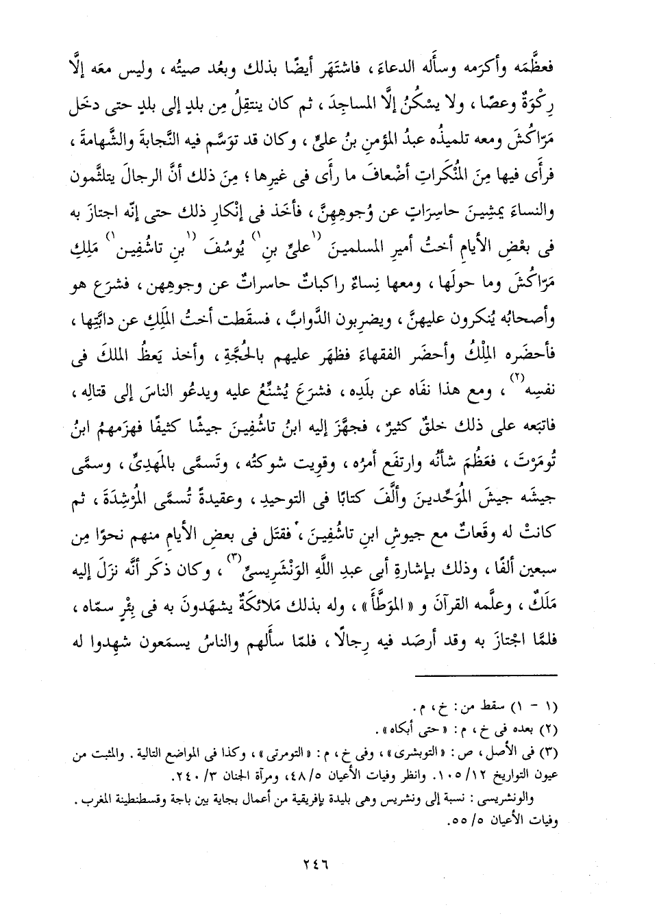 فَعَظَّمَهُ وَأَكْرَمَهُ وَسَأَلَهُ الدُّعَاءَ فَاشْتُهِرَ أَيْضًا بِذَلِكَ وَبَعُدَ صِيتُهُ، وَلَيْسَ مَعَهُ إِلَّا رِكْوَةٌ وَعَصًا، وَلَا يَسْكُنُ إِلَّا الْمَسَاجِدَ، ثُمَّ كَانَ يَنْتَقِلُ مِنْ بَلَدٍ إِلَى بَلَدٍ حَتَّى دَخَلَ مَرَّاكُشَ، وَمَعَهُ تِلْمِيذُهُ عَبْدُ الْمُؤْمِنِ بْنُ عَلِيٍّ، وَكَانَ وَقَدْ كَانَ تَوَسَّمَ فِيهِ النَّجَابَةَ وَالشَّهَامَةَ، فَرَأَى فِيهَا مِنَ الْمُنْكَرَاتِ أَضْعَافَ مَا رَأَى فِي غَيْرِهَا ; مِنْ ذَلِكَ أَنَّ الرِّجَالَ يَتَلَثَّمُونَ وَالنِّسَاءَ يَمْشِينَ حَاسِرَاتٍ عَنْ وُجُوهِهِنَّ، فَأَخَذَ فِي إِنْكَارِ ذَلِكَ، حَتَّى إِنَّهُ اجْتَازَ بِهِ فِي بَعْضِ الْأَيَّامِ أُخْتُ أَمِيرِ الْمُسْلِمِينَ عَلِيِّ بْنِ يُوسُفَ بْنِ تَاشُفِينَ مَلِكِ مَرَّاكُشَ وَمَا حَوْلَهَا، وَمَعَهَا نِسَاءٌ رَاكِبَاتٌ حَاسِرَاتٌ عَنْ وُجُوهِهِنَّ، فَشَرَعَ هُوَ وَأَصْحَابُهُ يُنْكِرُونَ عَلَيْهِنَّ وَيَضْرِبُونَ الدَّوَابَّ، فَسَقَطَتْ أُخْتُ الْمَلِكِ عَنْ دَابَّتِهَا، فَأَحْضَرَهُ الْمَلِكُ وَأَحْضَرَ الْفُقَهَاءَ فَظَهَرَ عَلَيْهِمْ بِالْحُجَّةِ، وَأَخَذَ يَعِظُ الْمَلِكَ فِي نَفْسِهِ، وَمَعَ هَذَا نَفَاهُ الْمَلِكُ عَنْ بَلَدِهِ، فَشَرَعَ يُشَنِّعُ عَلَيْهِ وَيَدْعُو النَّاسَ إِلَى قِتَالِهِ، فَاتَّبَعَهُ عَلَى ذَلِكَ خَلْقٌ كَثِيرٌ، فَجَهَّزَ إِلَيْهِ ابْنُ تَاشُفِينَ جَيْشًا كَثِيفًا فَهَزَمَهُمُ ابْنُ تُومَرْتَ، فَعَظُمَ شَأْنُهُ وَارْتَفَعَ أَمْرُهُ وَقَوِيَتْ شَوْكَتُهُ، وَتَسَمَّى بِالْمَهْدِيِّ، وَسَمَّى جَيْشَهُ جَيْشَ الْمُوَحِّدِينَ، وَأَلَّفَ كِتَابًا فِي التَّوْحِيدِ وَعَقِيدَةً تُسَمَّى الْمُرْشِدَةُ، ثُمَّ كَانَتْ لَهُ وَقَعَاتٌ مَعَ جُيُوشِ ابْنِ تَاشُفِينَ، فَقَتَلَ فِي بَعْضِ الْأَيَّامِ مِنْهُمْ نَحْوًا مِنْ سَبْعِينَ أَلْفًا، وَذَلِكَ بِإِشَارَةِ أَبِي عَبْدِ اللَّهِ الْوَنْشَرِيسِيِّ، وَكَانَ ذَكَرَ أَنَّهُ نَزَلَ إِلَيْهِ مَلَكٌ وَعَلَّمَهُ الْقُرْآنَ وَ " الْمُوَطَّأَ " وَلَهُ بِذَلِكَ مَلَائِكَةٌ يَشْهَدُونَ بِهِ فِي بِئْرٍ سَمَّاهُ، فَلَمَّا اجْتَازَ بِهِ وَكَانَ قَدْ أَرْصَدَ فِيهِ رِجَالًا، فَلَمَّا سَأَلَهُمْ وَالنَّاسُ يَسْمَعُونَ شَهِدُوا لَهُ
