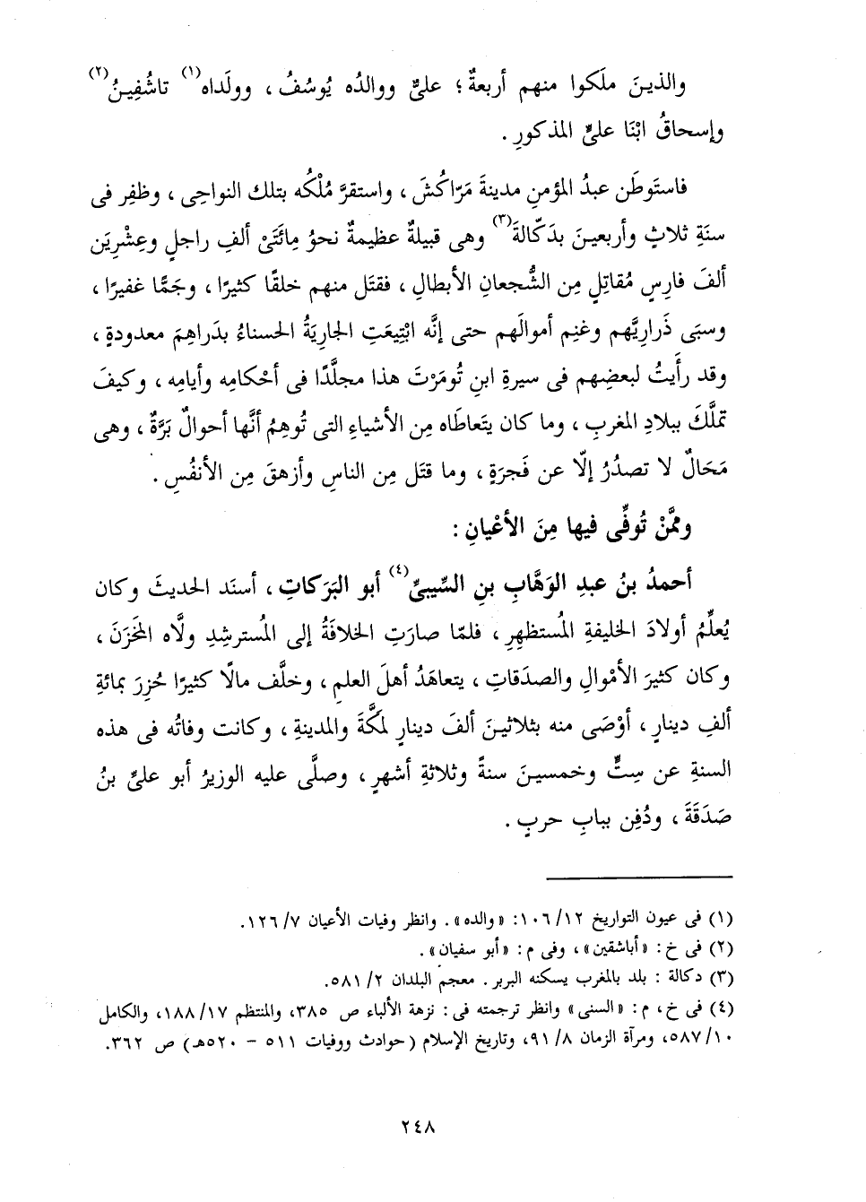 فَاسْتَوْطَنَ عَبْدُ الْمُؤْمِنِ مَدِينَةَ مَرَّاكُشَ، وَاسْتَقَرَّ مُلْكُهُ بِتِلْكَ النَّاحِيَةِ، وَظَفِرَ فِي سَنَةِ ثَلَاثٍ وَأَرْبَعِينَ بِدَكَّالَةَ، وَهِيَ قَبِيلَةٌ عَظِيمَةٌ نَحْوُ مِائَتَيْ أَلْفِ رَاجِلٍ وَعِشْرِينَ أَلْفِ فَارِسٍ مُقَاتِلٍ مِنَ الشُّجْعَانِ الْأَبْطَالِ، فَقَتَلَ مِنْهُمْ خَلْقًا كَثِيرًا وَجَمًّا غَفِيرًا، وَسَبَى ذَرَارِيَّهُمْ، وَغَنِمَ أَمْوَالَهُمْ، حَتَّى إِنَّهُ بِيعَتِ الْجَارِيَةُ الْحَسْنَاءُ بِدَرَاهِمَ مَعْدُودَةٍ وَقَدْ رَأَيْتُ لِبَعْضِهِمْ فِي سِيرَةِ ابْنِ تُومَرْتَ هَذَا مُجَلَّدًا فِي أَحْكَامِهِ وَأَيَّامِهِ، وَكَيْفَ تَمَلَّكَ بِبِلَادِ الْمَغْرِبِ، وَمَا كَانَ يَتَعَاطَاهُ مِنَ الْأَشْيَاءِ الَّتِي تُوهِمُ أَنَّهَا أَحْوَالٌ بَرَّةٌ، وَهِيَ مَحَالُّ لَا تَصْدُرُ إِلَّا عَنْ فَجَرَةٍ، وَمَا قَتَلَ مِنَ النَّاسِ وَأَزْهَقَ مِنَ الْأَنْفُسِ.