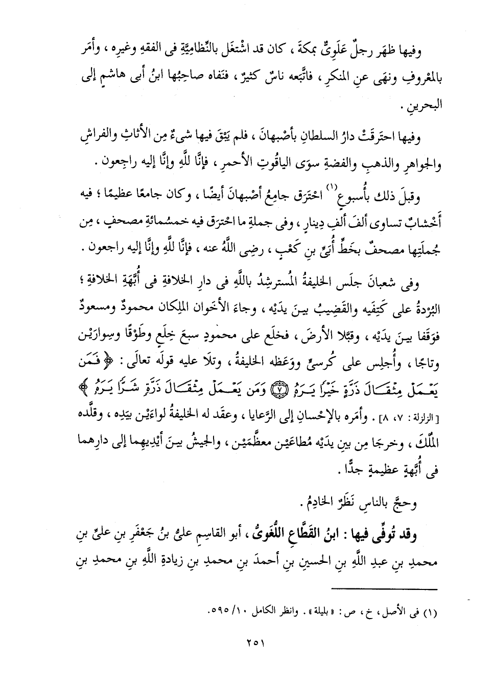 وَقَبْلَ ذَلِكَ بِأُسْبُوعٍ احْتَرَقَ جَامِعُ أَصْبَهَانَ أَيْضًا، وَكَانَ جَامِعًا عَظِيمًا فِيهِ أَخْشَابٌ تُسَاوِي أَلْفَ أَلْفِ دِينَارٍ، وَفِي جُمْلَةِ مَا احْتَرَقَ فِيهِ خَمْسُمِائَةِ مُصْحَفٍ ; مِنْ جُمْلَتِهَا مُصْحَفٌ بِخَطِّ أُبَيِّ بْنِ كَعْبٍ، فَإِنَّا لِلَّهِ وَإِنَّا إِلَيْهِ رَاجِعُونَ.