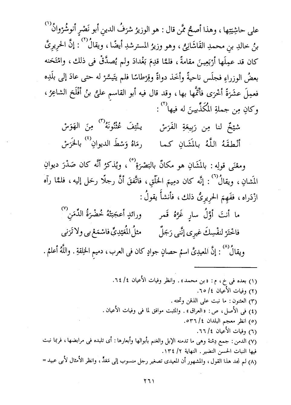 عَلَى حَاشِيَتِهَا، وَهَذَا أَصَحُّ مِمَّنْ قَالَ: هُوَ الْوَزِيرُ شَرَفُ الدِّينِ أَبُو نَصْرٍ أَنُوشُرْوَانُ بْنُ خَالِدِ بْنِ مُحَمَّدٍ الْقَاشَانِيُّ، وَهُوَ وَزِيرُ الْمُسْتَرْشِدِ أَيْضًا، وَيُقَالُ: إِنَّ الْحَرِيرِيَّ كَانَ قَدْ عَمِلَهَا أَرْبَعِينَ مَقَامَةً، فَلَمَّا قَدِمَ بَغْدَادَ وَلَمْ يُصَدَّقْ فِي ذَلِكَ، وَامْتَحَنَهُ بَعْضُ الْوُزَرَاءِ فَجَلَسَ نَاحِيَةً وَأَخَذَ دَوَاةً وَقِرْطَاسًا فَلَمْ يَتَيَسَّرْ لَهُ، حَتَّى عَادَ إِلَى بَلَدِهِ فَعَمِلَ عَشَرَةً أُخْرَى، فَأَتَمَّهَا خَمْسِينَ مَقَامَةً، وَقَدْ قَالَ فِيهِ أَبُو الْقَاسِمِ عَلِيُّ بْنُ أَفْلَحَ الشَّاعِرُ، وَكَانَ مِنْ جُمْلَةِ الْمُكَذِّبِينَ لَهُ فِيهَا: