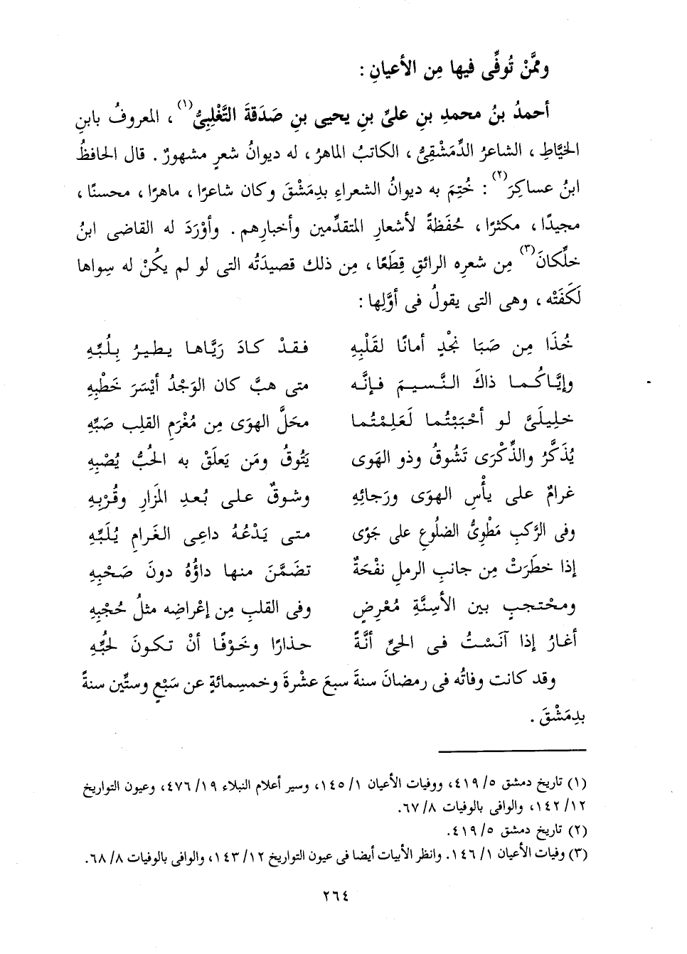 وَمِمَّنْ تُوُفِّيَ فِيهَا مِنَ الْأَعْيَانِ أَحْمَدُ بْنُ مُحَمَّدِ بْنِ عَلِيِّ بْنِ يَحْيَى بْنِ صَدَقَةَ التَّغْلِبِيُّ.
