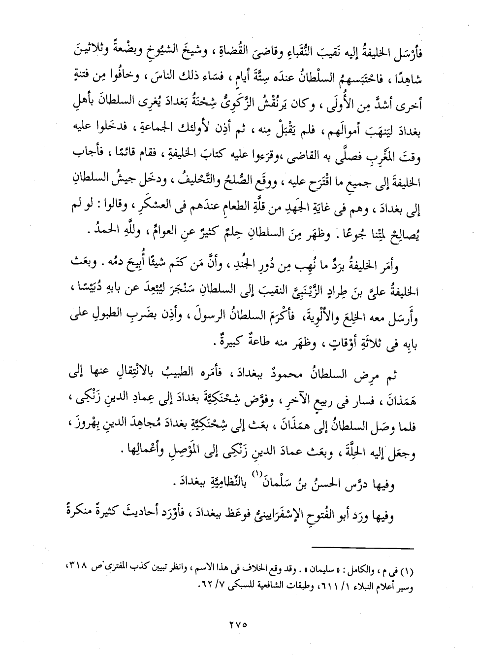 فَأَرْسَلَ إِلَيْهِ الْخَلِيفَةُ نَقِيبَ النُّقَبَاءِ وَقَاضِيَ الْقُضَاةِ وَشَيْخَ الشُّيُوخِ وَبِضْعَةً وَثَلَاثِينَ شَاهِدًا، فَاحْتَبَسَهُمُ السُّلْطَانُ عِنْدَهُ سِتَّةَ أَيَّامٍ، فَسَاءَ ذَلِكَ النَّاسَ وَخَافُوا مِنْ فِتْنَةٍ أُخْرَى أَشَدَّ مِنَ الْأُولَى، وَكَانَ يَرَنُقْشُ الزَّكَوِيُّ شِحْنَةُ بَغْدَادَ يُغْرِي السُّلْطَانَ بِأَهْلِ بَغْدَادَ لِيَنْهَبَ أَمْوَالَهُمْ، فَلَمْ يَقْبَلْ مِنْهُ، ثُمَّ أَذِنَ لِأُولَئِكَ الْجَمَاعَةِ فَدَخَلُوا عَلَيْهِ وَقْتَ الْمَغْرِبِ، فَصَلَّى بِهِمُ الْقَاضِي وَقَرَءُوا عَلَيْهِ كِتَابَ الْخَلِيفَةِ، فَقَامَ قَائِمًا، فَأَجَابَ الْخَلِيفَةَ إِلَى جَمِيعِ مَا اقْتَرَحَ عَلَيْهِ، وَوَقَعَ الصُّلْحُ وَالتَّحْلِيفُ، وَدَخَلَ جَيْشُ السُّلْطَانِ إِلَى بَغْدَادَ وَهُمْ فِي غَايَةِ الْجَهْدِ مِنْ قِلَّةِ الطَّعَامِ عِنْدَهُمْ فِي الْعَسْكَرِ، وَقَالُوا: لَوْ لَمْ يُصَالِحْ لَمِتْنَا جُوعًا، وَظَهَرَ مِنَ السُّلْطَانِ حِلْمٌ كَثِيرٌ عَنِ الْعَوَامِّ، وَلِلَّهِ الْحَمْدُ.