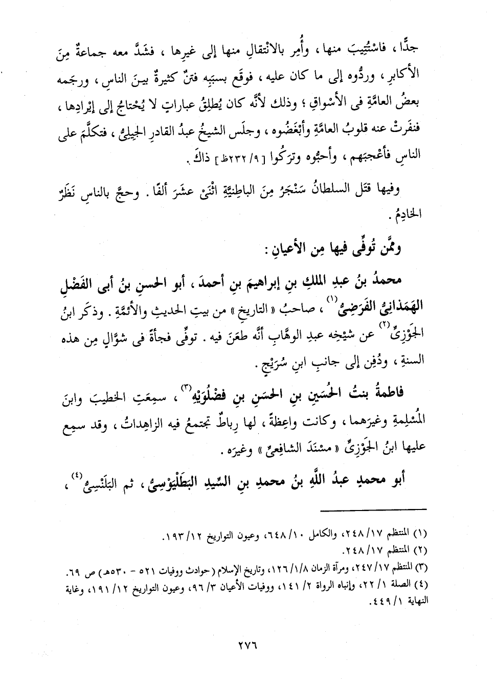 جِدًّا، فَاسْتُتِيبَ مِنْهَا، وَأُمِرَ بِالِانْتِقَالِ مِنْهَا إِلَى غَيْرِهَا، فَشَدَّ مَعَهُ جَمَاعَةٌ مِنَ الْأَكَابِرِ، وَرَدُّوهُ إِلَى مَا كَانَ عَلَيْهِ، فَوَقَعَ بِسَبَبِهِ فِتَنٌ كَثِيرَةٌ بَيْنَ النَّاسِ، وَرَجَمَهُ بَعْضُ الْعَامَّةِ فِي الْأَسْوَاقِ؛ وَذَلِكَ لِأَنَّهُ كَانَ يُطْلِقُ عِبَارَاتٍ لَا يُحْتَاجُ إِلَى إِيرَادِهَا، فَنَفَرَتْ مِنْهُ قُلُوبُ الْعَامَّةِ وَأَبْغَضُوهُ، وَجَلَسَ الشَّيْخُ عَبْدُ الْقَادِرِ الْجِيلِيُّ فَتَكَلَّمَ عَلَى النَّاسِ فَأَعْجَبَهُمْ، وَأَحَبُّوهُ وَتَرَكُوا ذَاكَ.